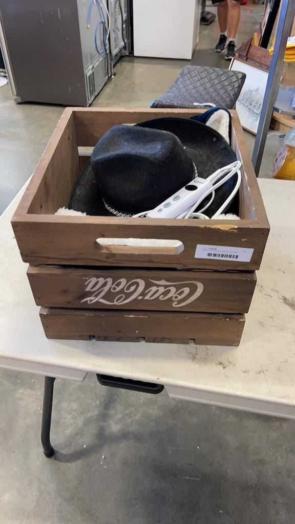 WOOD COCA COLA CRATE HEATED BLANKET AND COWBOY HAT
