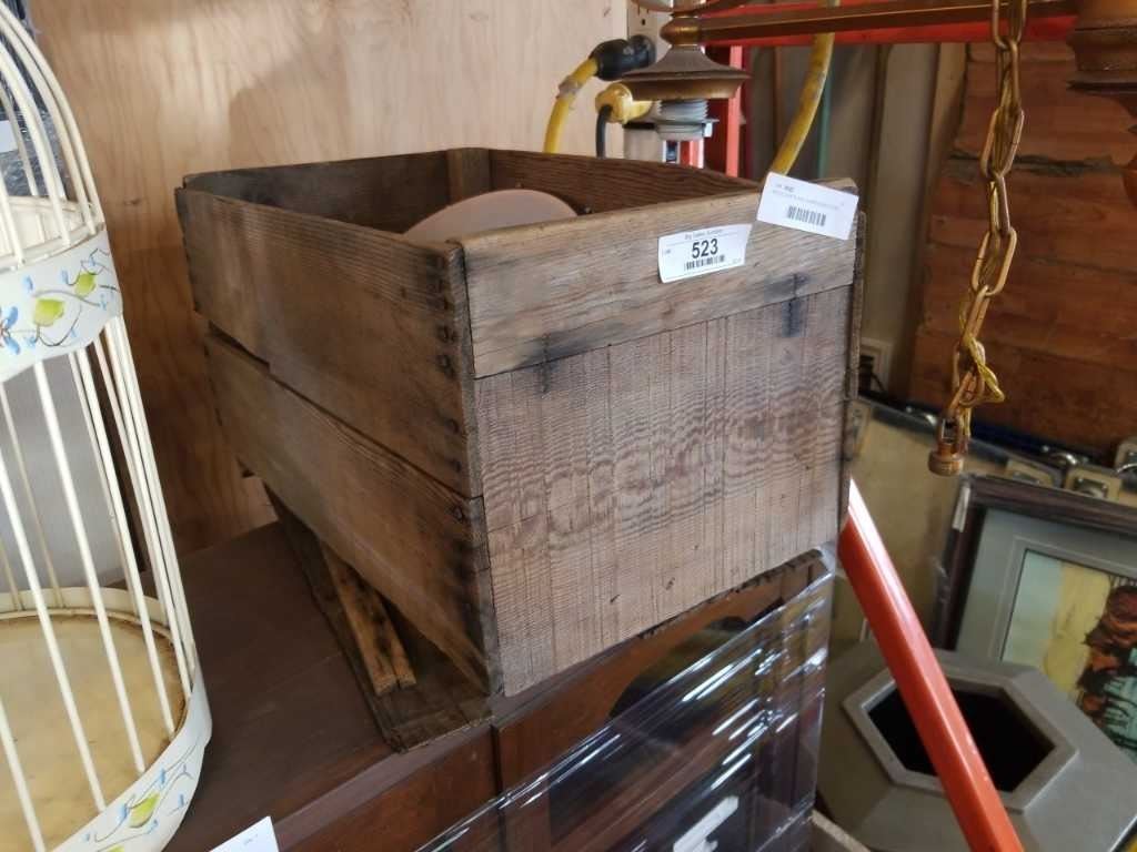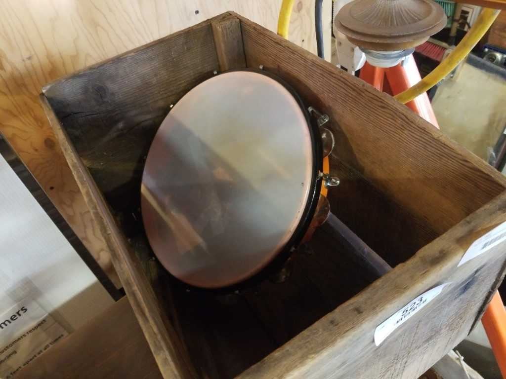 WOOD CRATE AND SHARPENING STONE AND TAMBOURINE