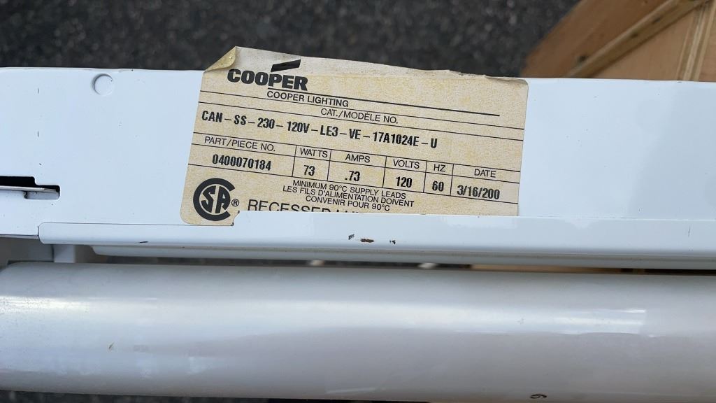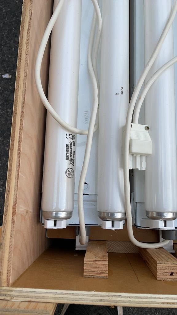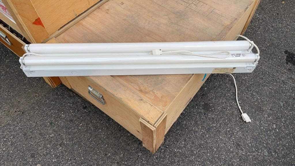 WOOD CRATE OF 10 DOUBLE LIGHT FIXTURES WITH BULBS 3FT LONG