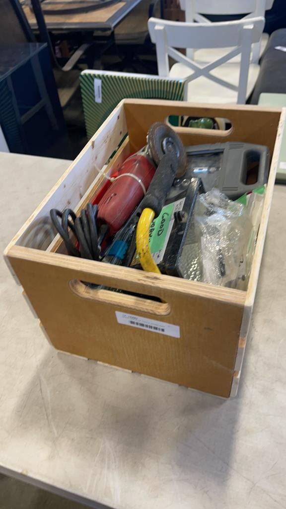 WOOD CRATE OF TOOLS, WORKLIGHT, SOCKETS DRILL BITS AND MORE