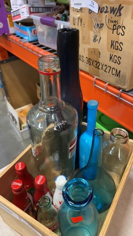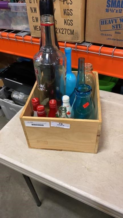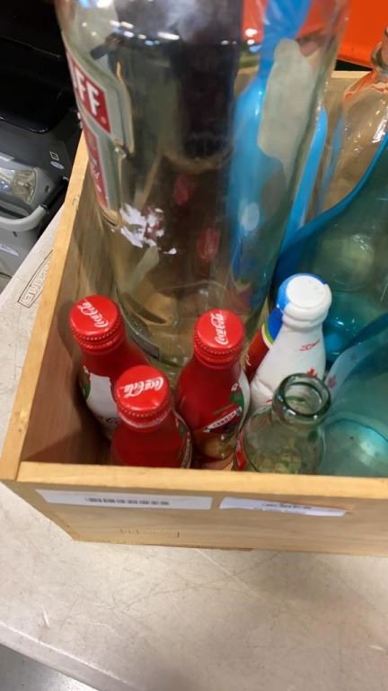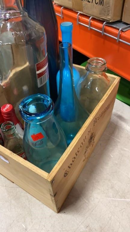 WOOD CRATE W/ VINTAGE BOTTLES AND COCA COLA BOTTLES