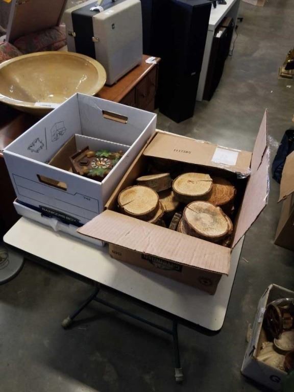 WOOD CUCKOO CLOCK AND BOX OF WOOD SLICE COASTERS