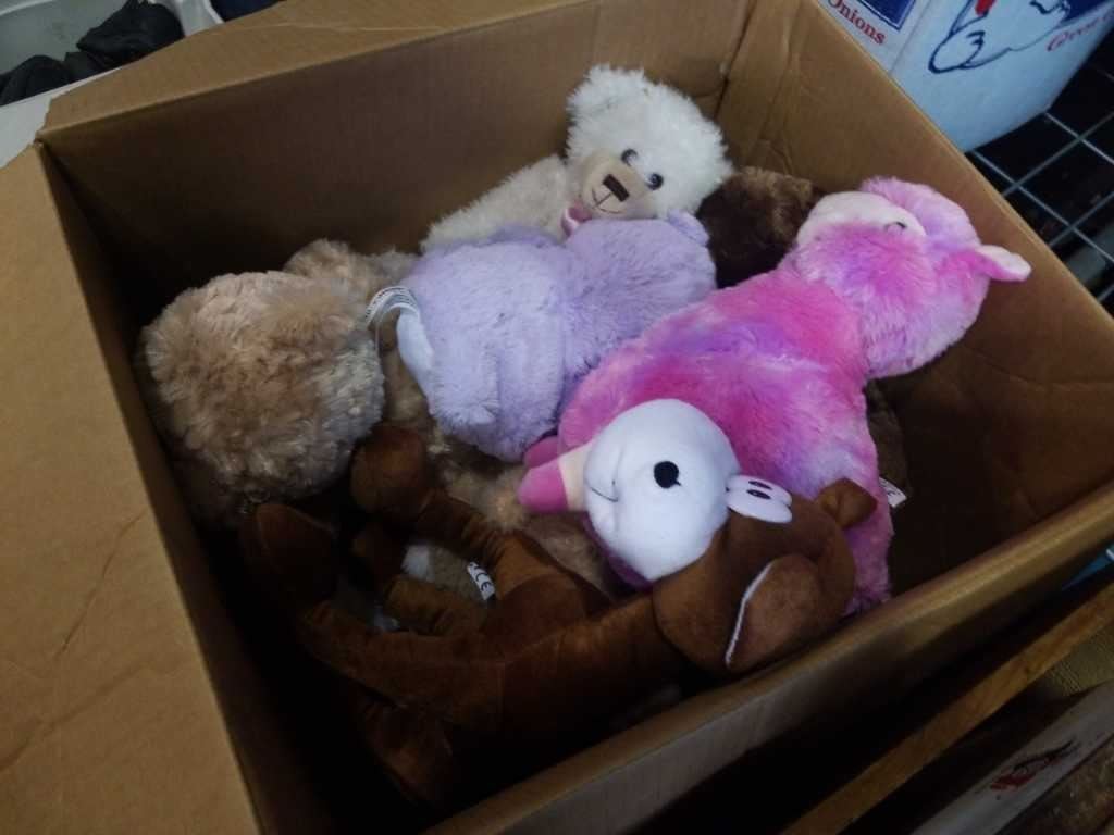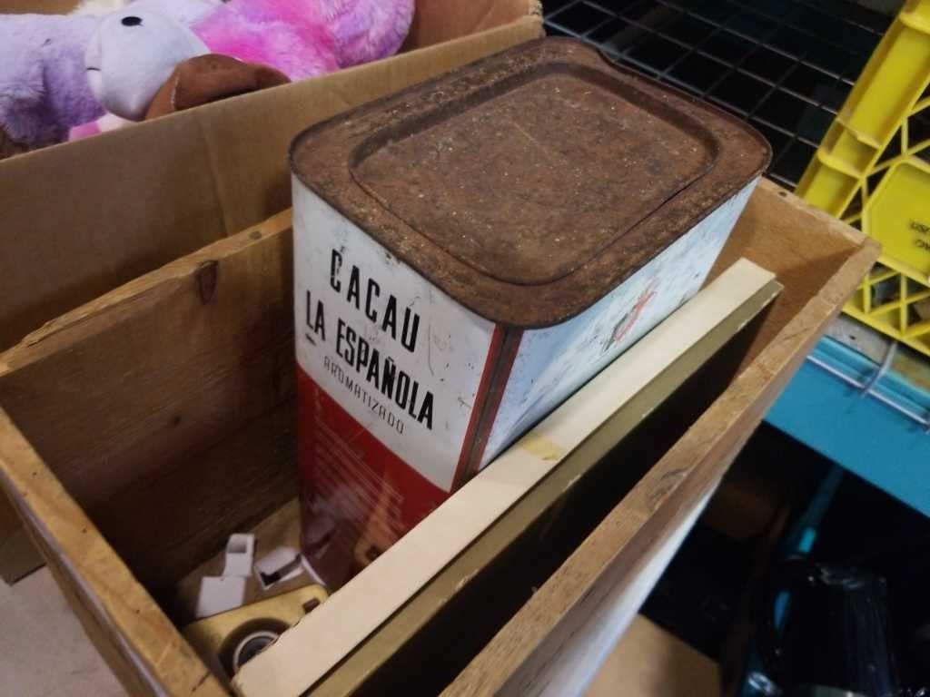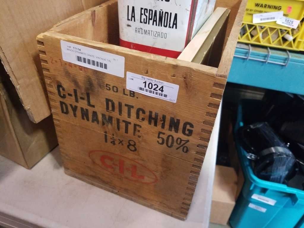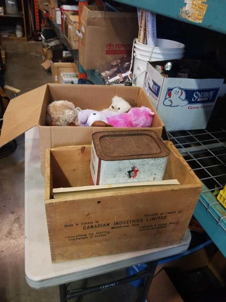 WOOD DYNAMITE CRATE, VINTAGE TIN, BRASS PEEP HOLE, AND STUFFED ANIMALS