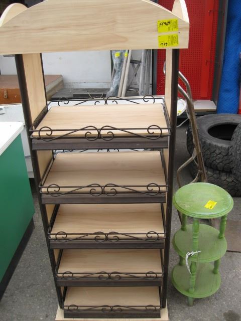 WOOD & METAL DISPLAY SHELF UNIT & A ROUND 3 TIER TABLE