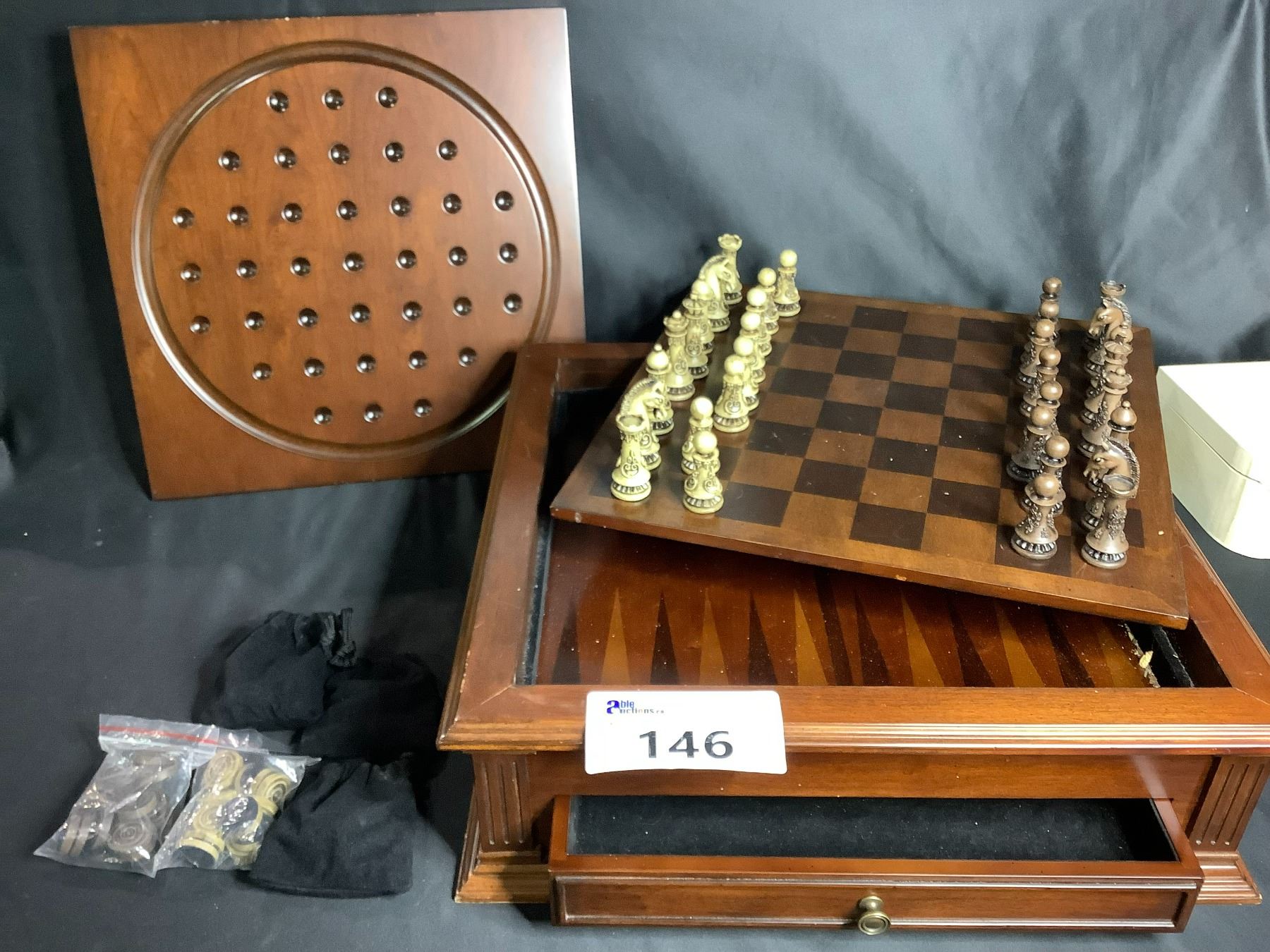 WOOD MULTI GAMES CABINET; CHESS, CHECKERS, BACKGAMMON AND CHINESE CHECKERS