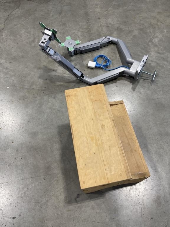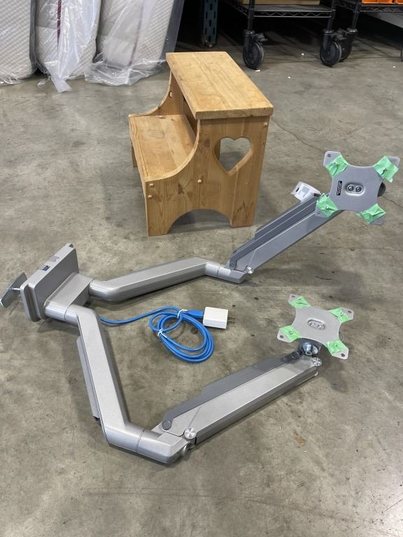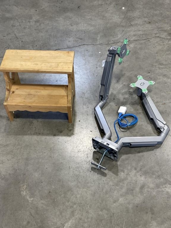 WOODEN 2 STEP STOOL AND DUAL MONITOR MOUNT