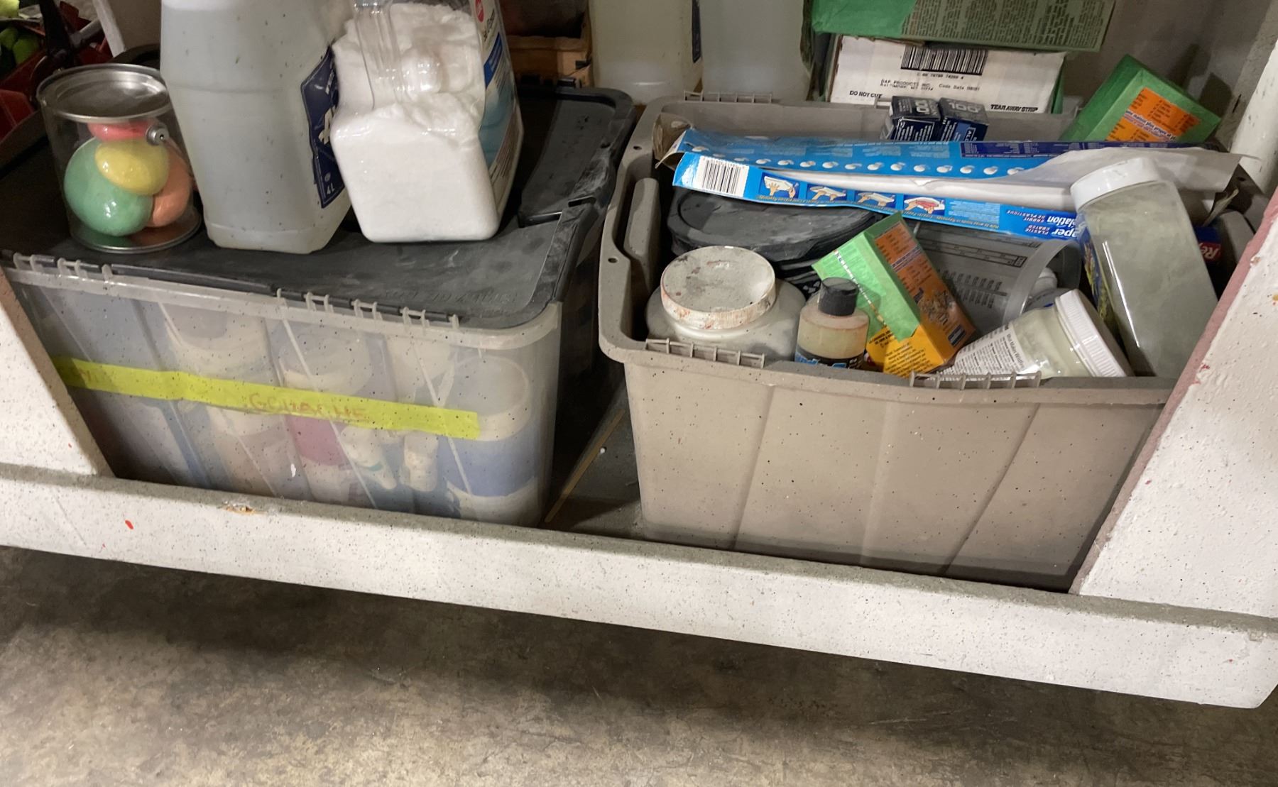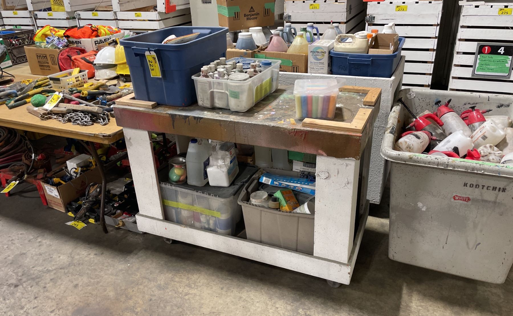 WOODEN 2 TIER MOBILE PRODUCT CART WITH ASSORTED PRINT SHOP DYES / PAINT / CHEMICALS *MOBILE CART INCLUDED*
