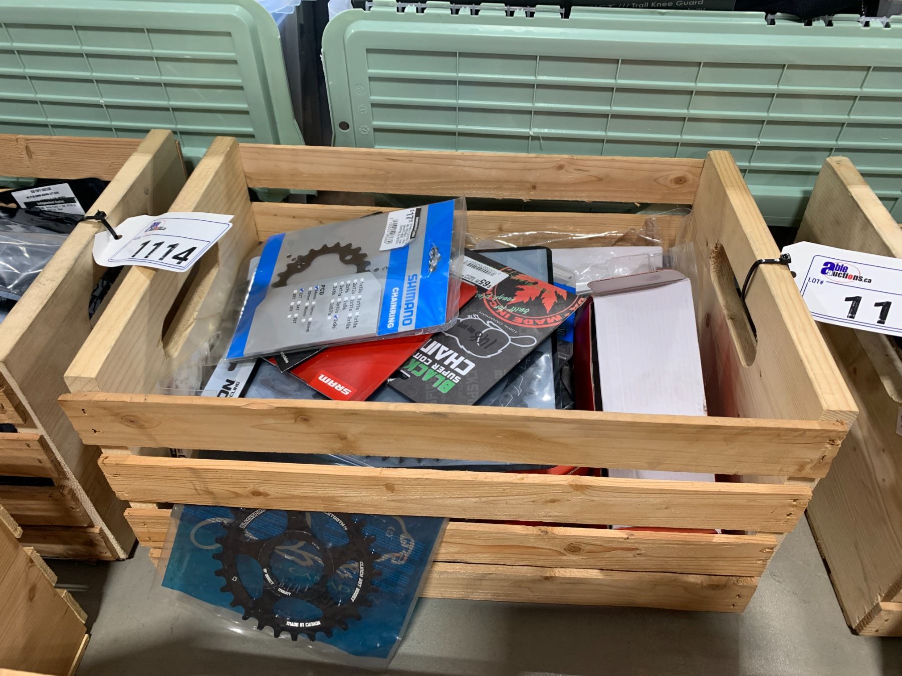 WOODEN BOX OF ASSORTED BIKE PARTS