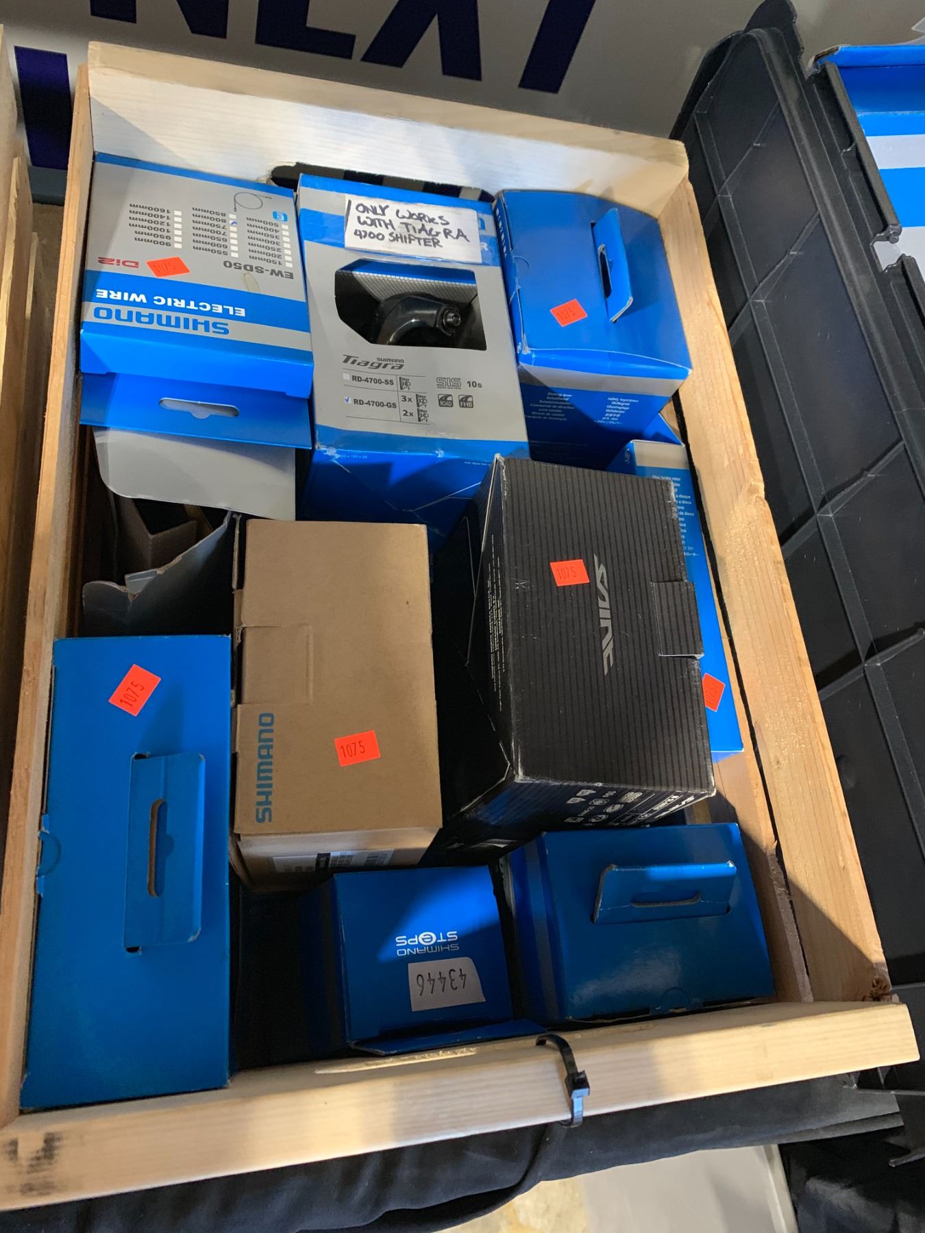 WOODEN BOX OF ASSORTED SHIMANO BIKE PARTS INCLUDING: DERAILLEUR, CASSETTE SPROCKET, DISC BRAKE ROTOR, FRONT HUB, SHIFT LEVER, ELECTRIC WIRE & MORE