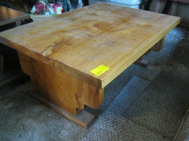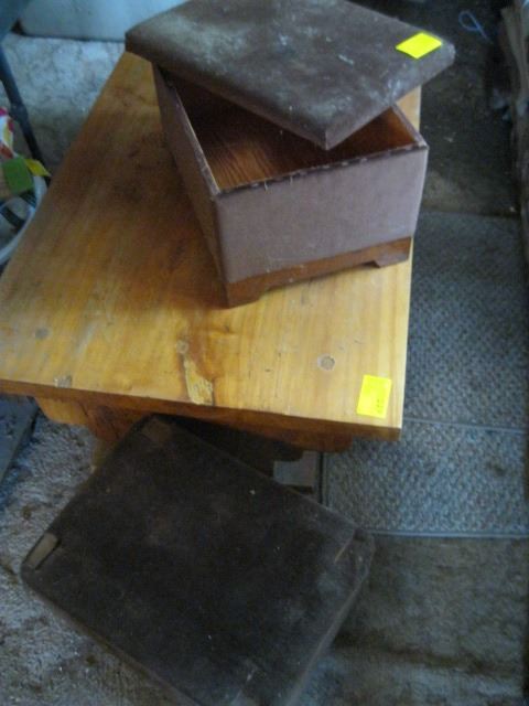 WOODEN COFFEE TABLE & 2 PADDED LIFTTOP STOOLS