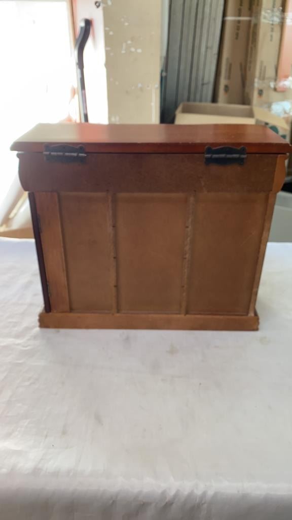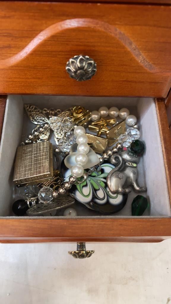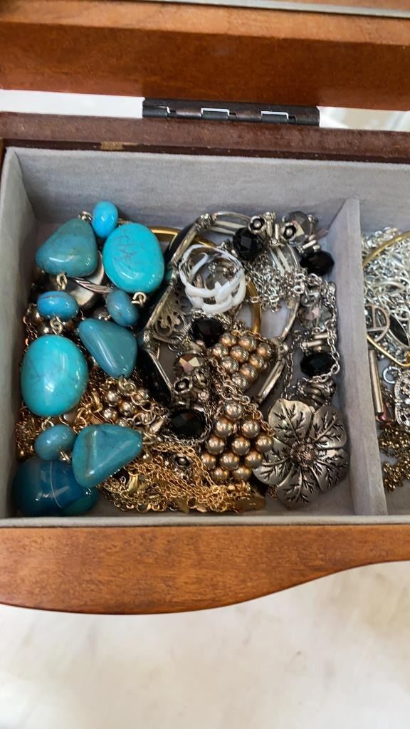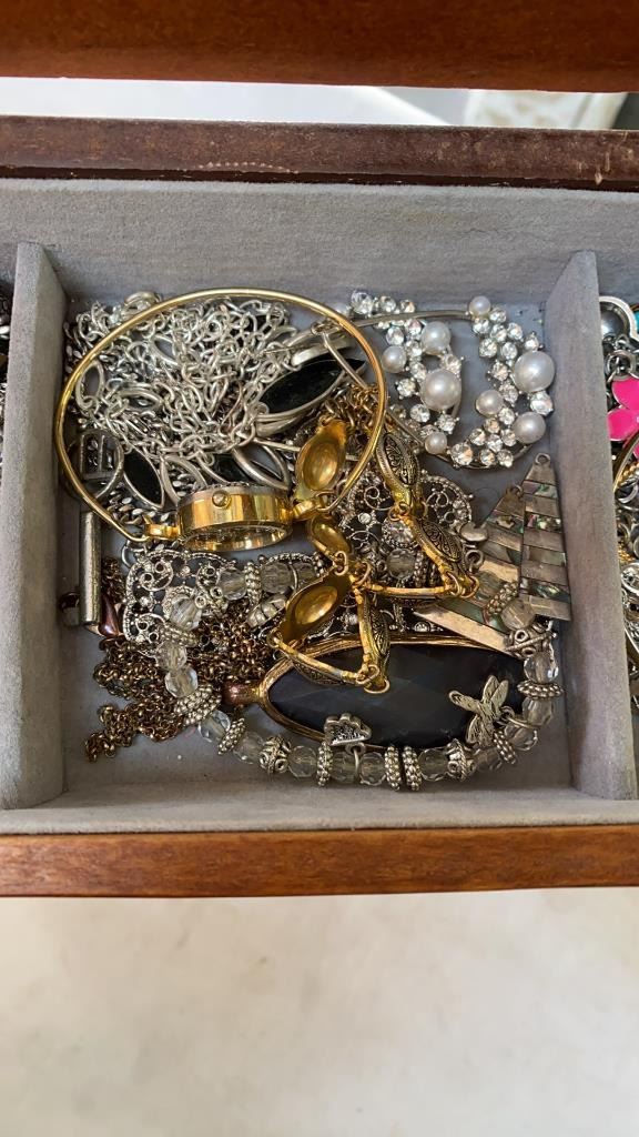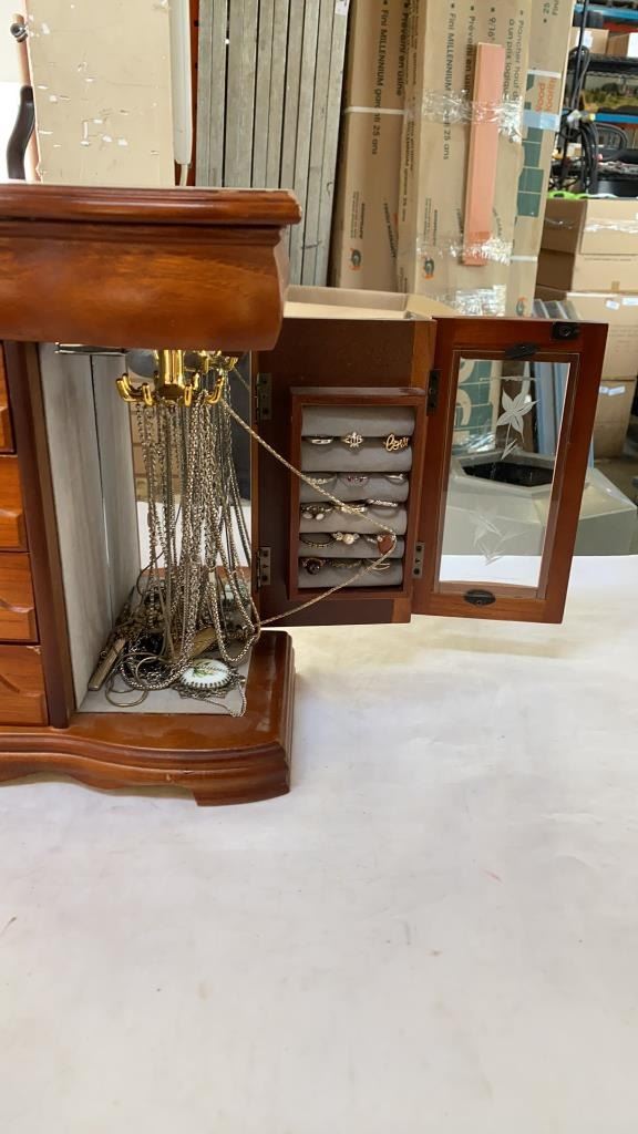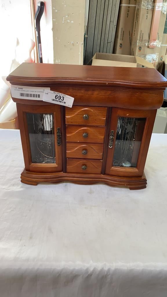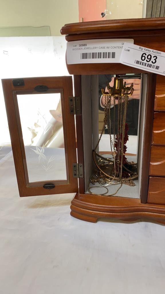 WOODEN JEWELLERY CASE W/ CONTENTS