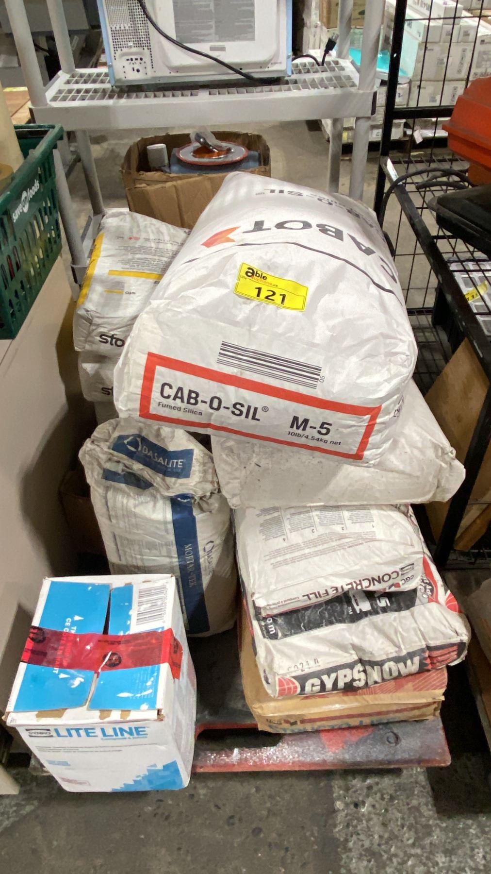 WOODEN MOBILE CART OF ASSORTED CHEMICALS/CONCRETE INCLUDING GYPSNOW, STRUCTO-LITE, CAB-O-SIL,