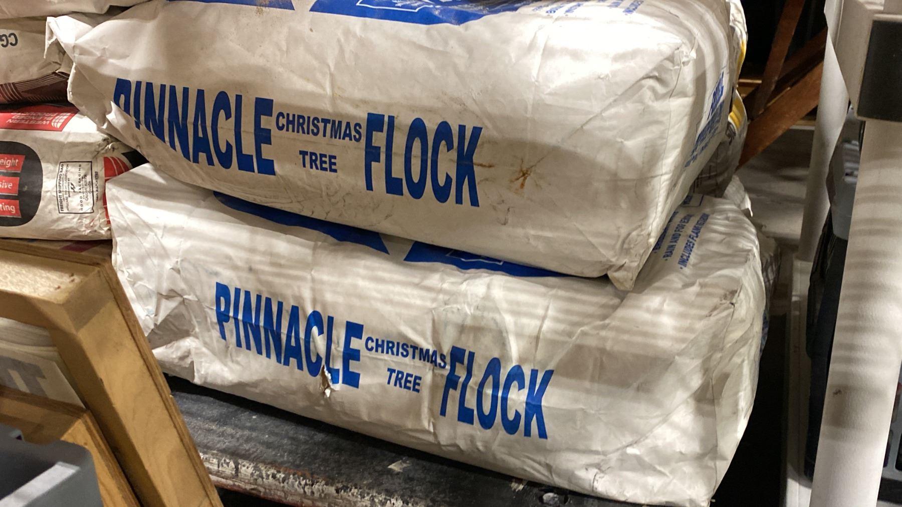 WOODEN MOBILE CART OF ASSORTED CHEMICALS/CONCRETE INCLUDING GYPSNOW, STRUCTO-LITE, CAB-O-SIL, MORTAR-TEK, STO BTS PLUS, PINNACLE CHRISTMAS TREE FLOCK & DIRT FX