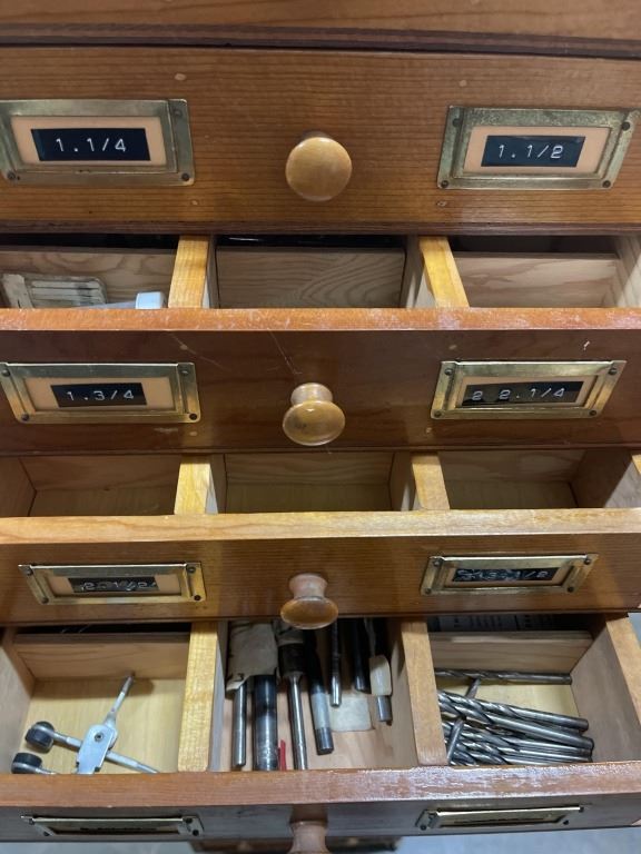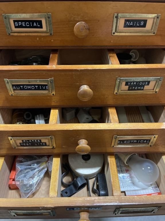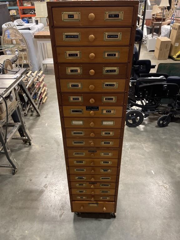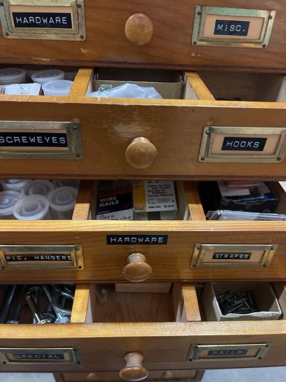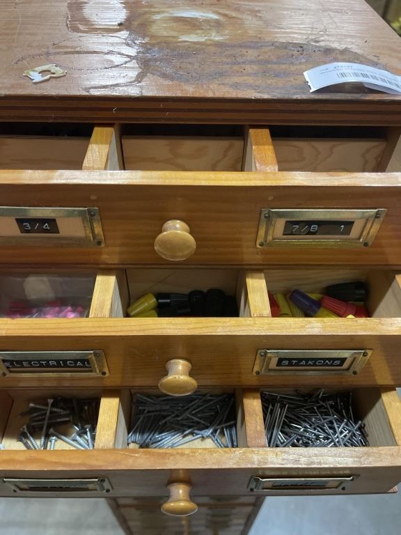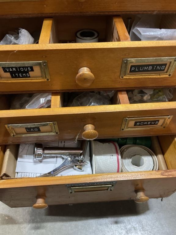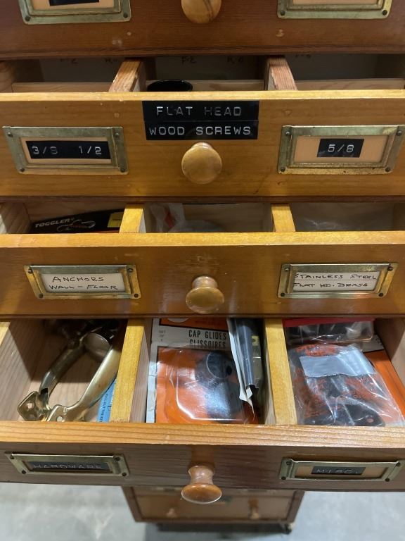 WOODEN ROLLING TOOL CABINERT FILLED WITH HARDWARE