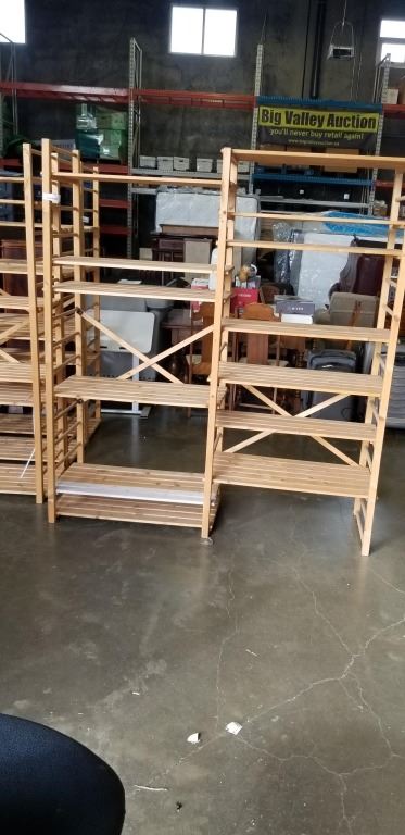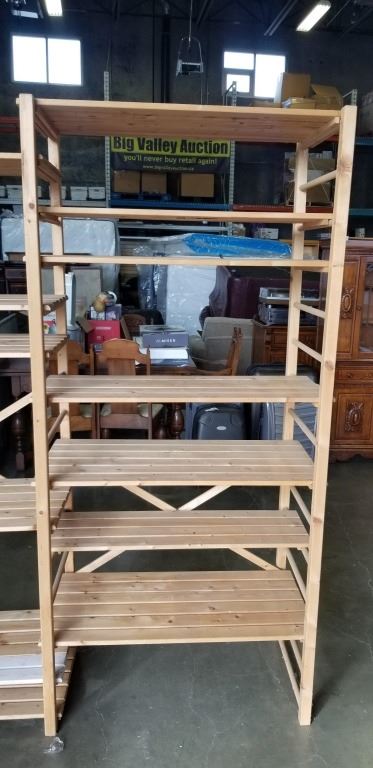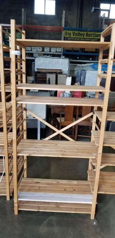 WOODEN SHELVING UNIT 67" WIDE BY 76" TALL