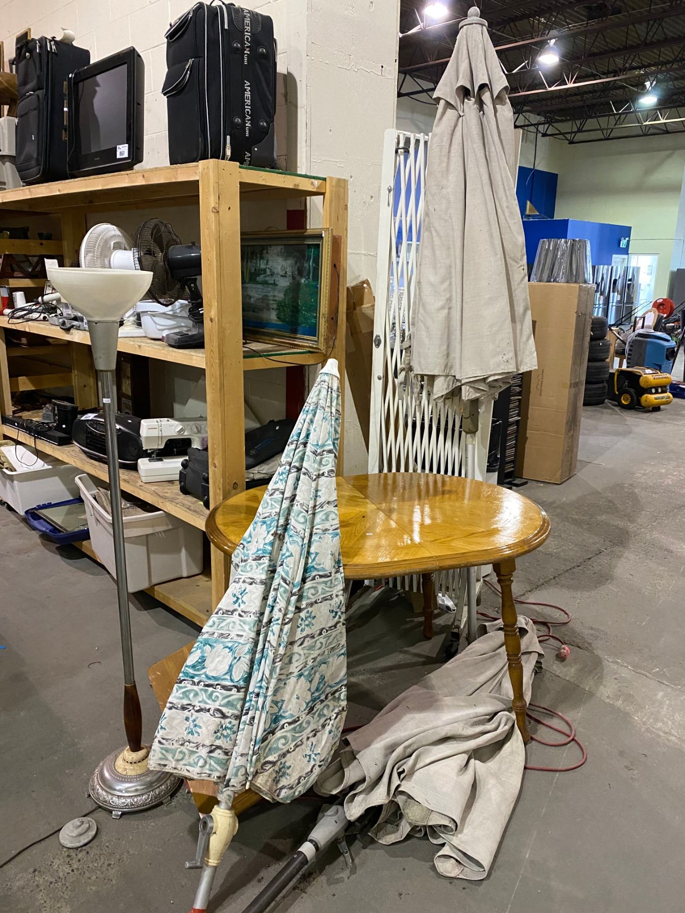 WOODEN TABLE, ASSORTED UMBRELLAS, & ANTIQUE LAMP