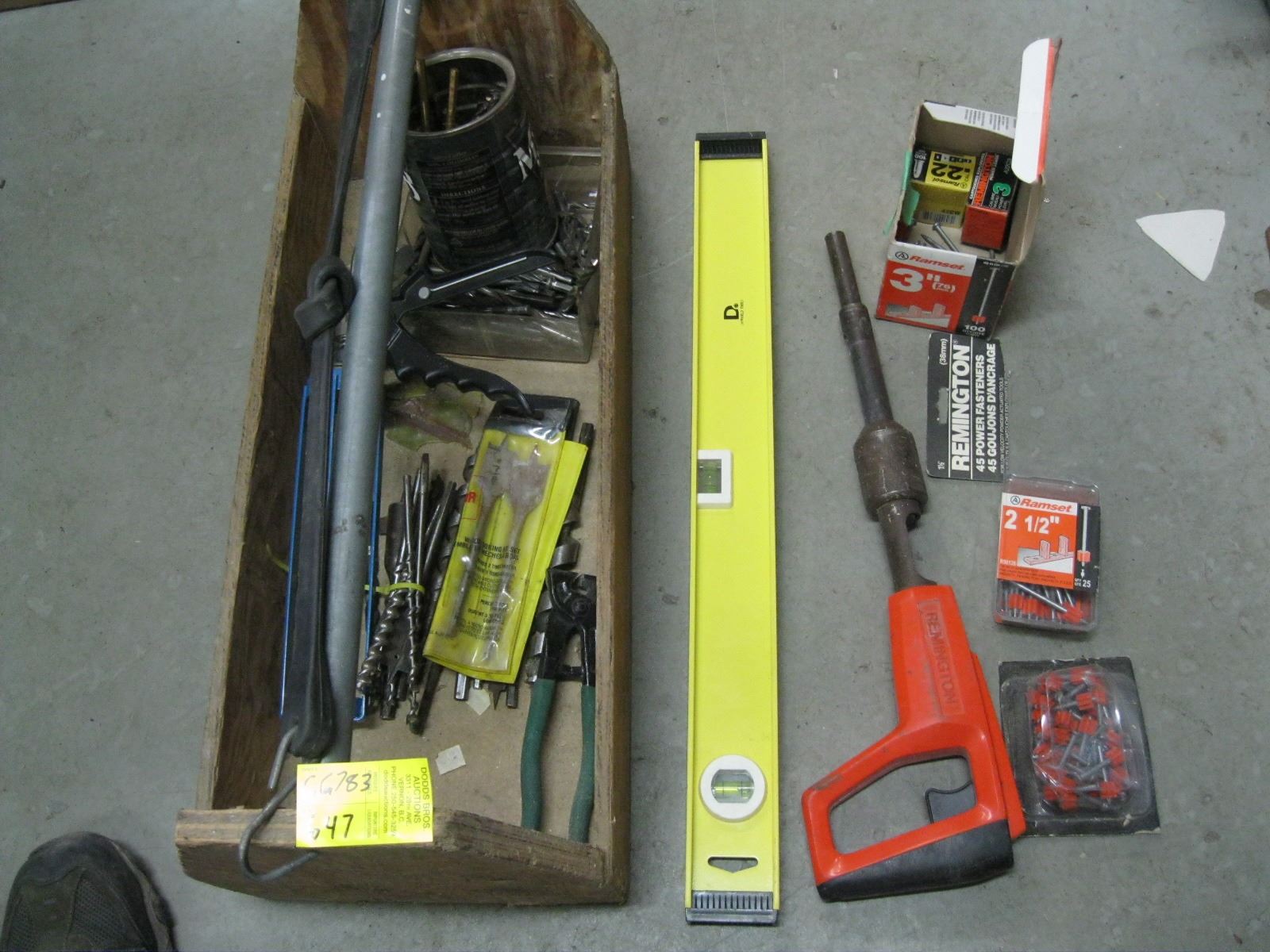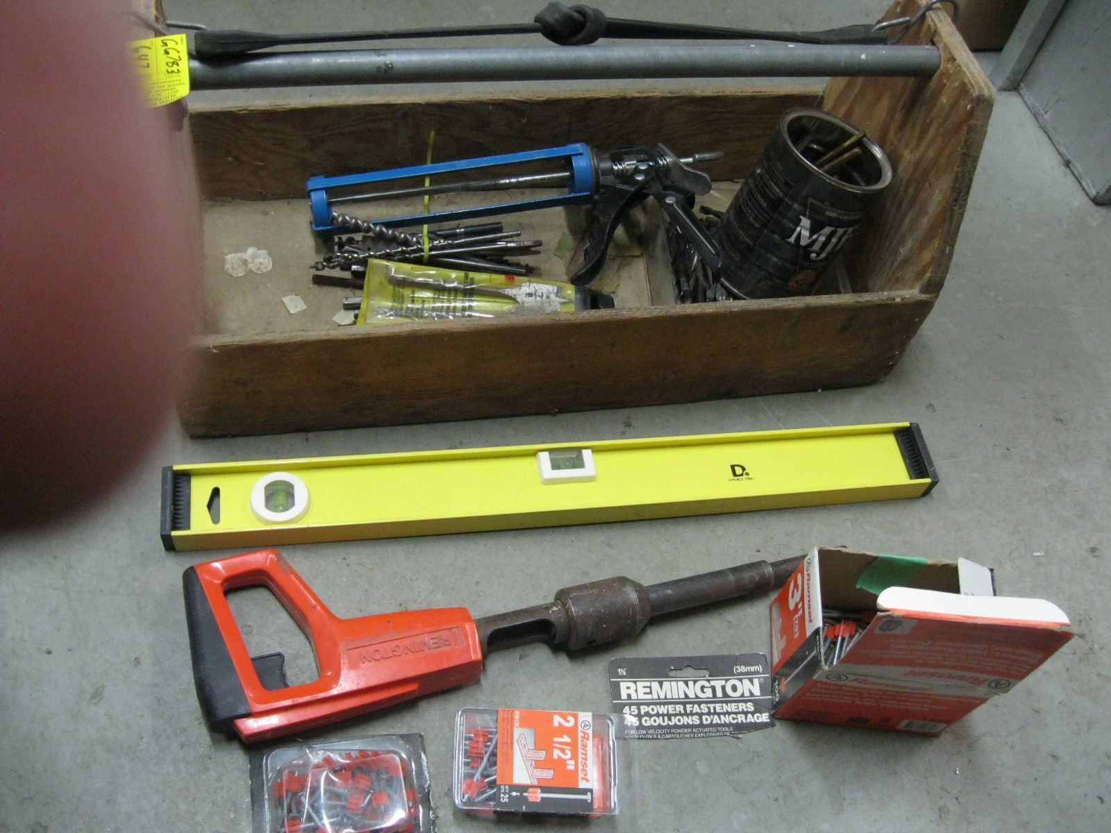 WOODEN TOOL TOTE OF MISC. DRILL BITS, ALLEN KEYS, LEVEL, ETC.
