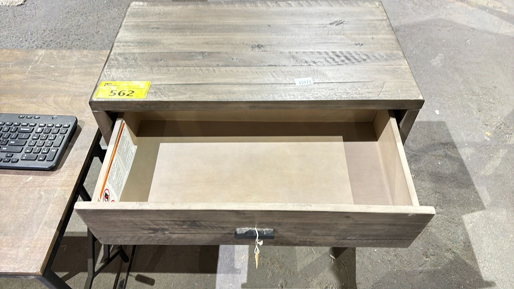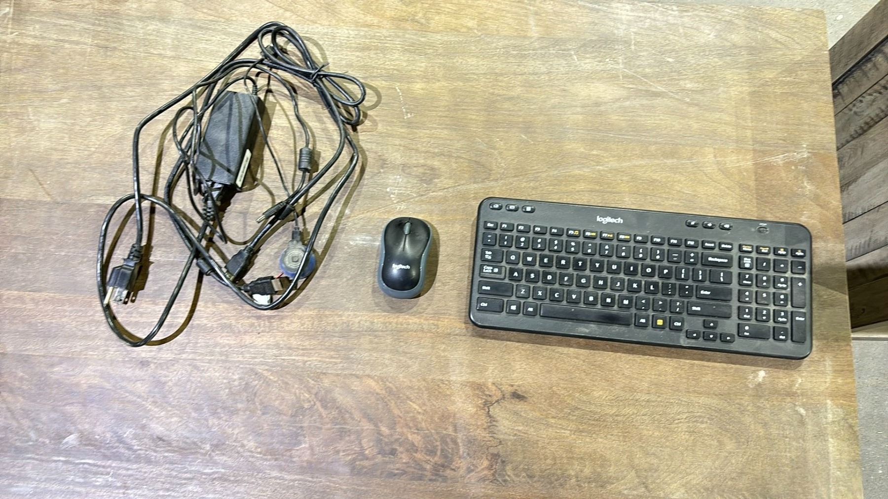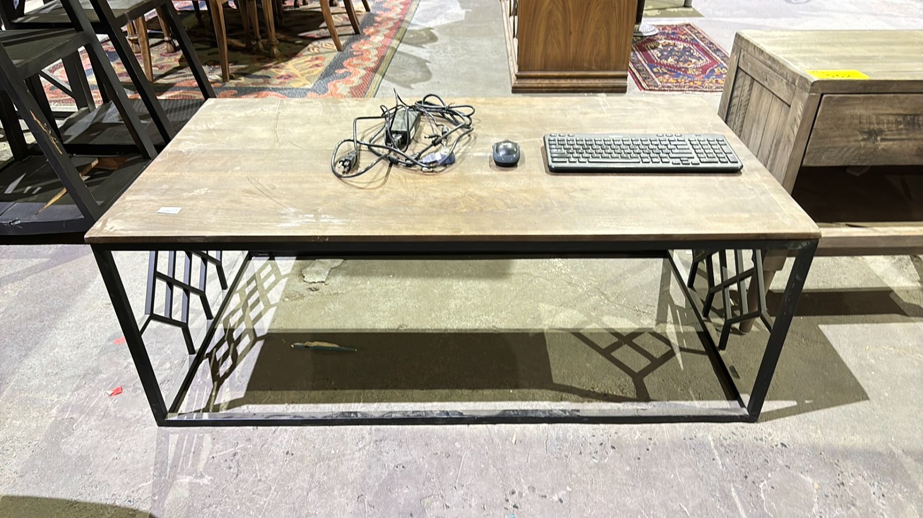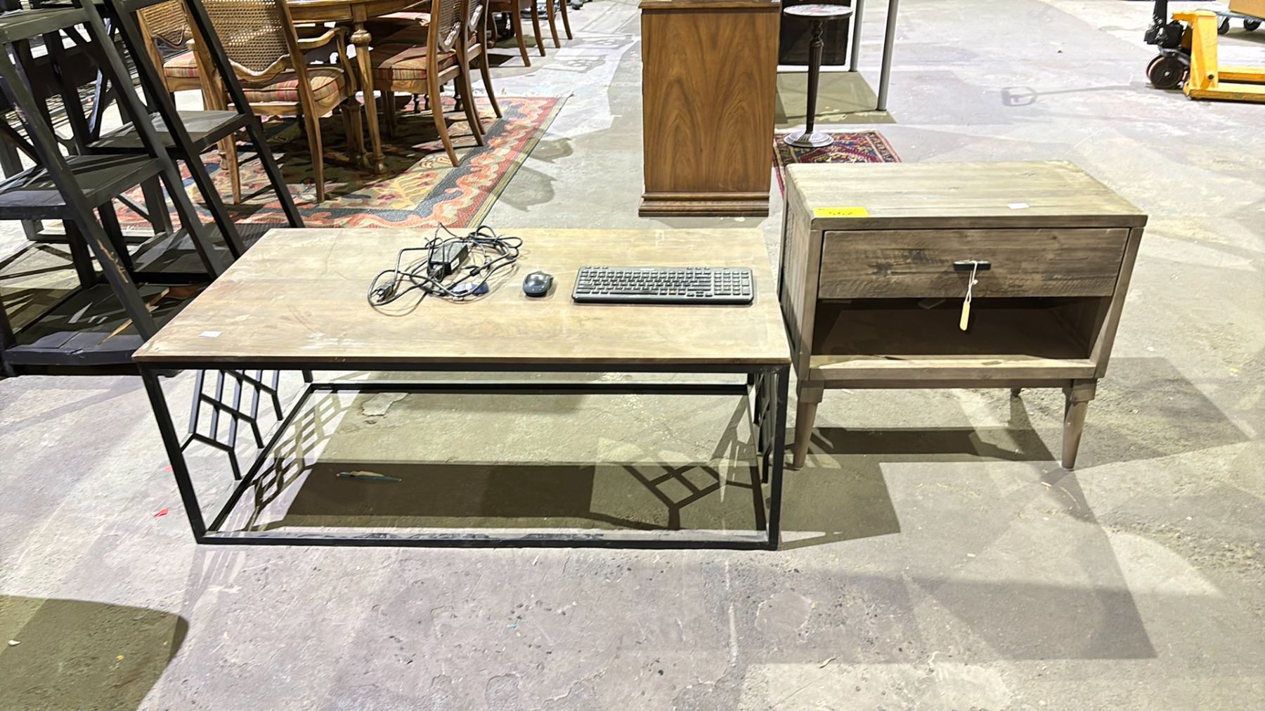 WOODEN TOP COFFEE TABLE, WOODEN SIDE TABLE AND KEY BOARD WITH MOUSE