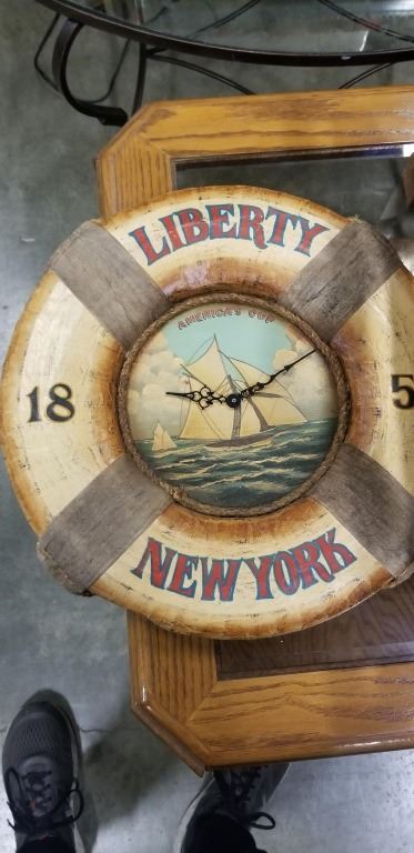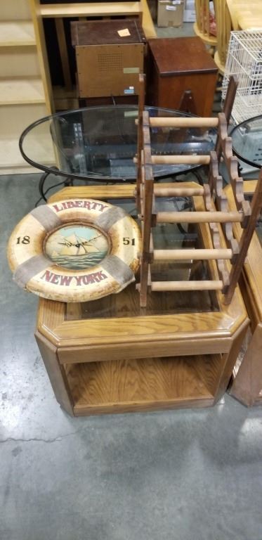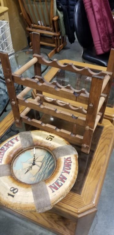 WOODEN WINE RACK AND LIFE BOUY STYLE CLOCK