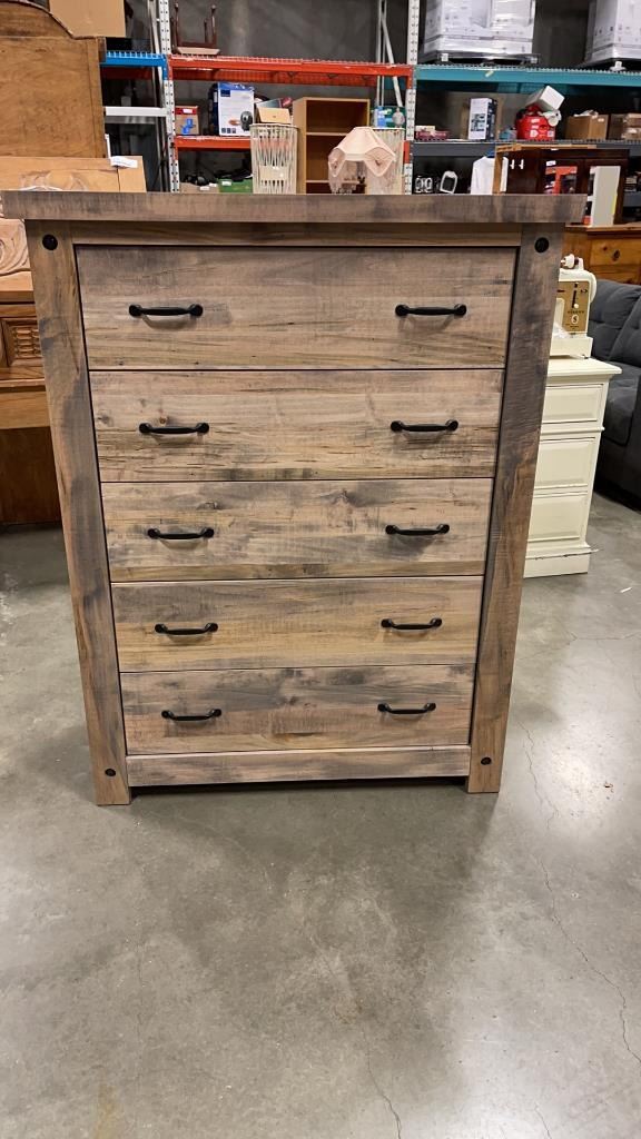 WOODWORKS "HARTLEY BAY" 5 DRAWER HIGHBOY DRESSER - CANADIAN BUILT, WEATHERED GREY STAIN, EXCELLENT