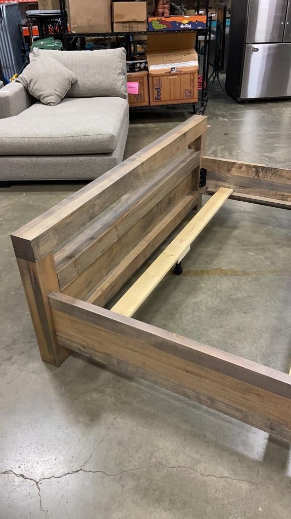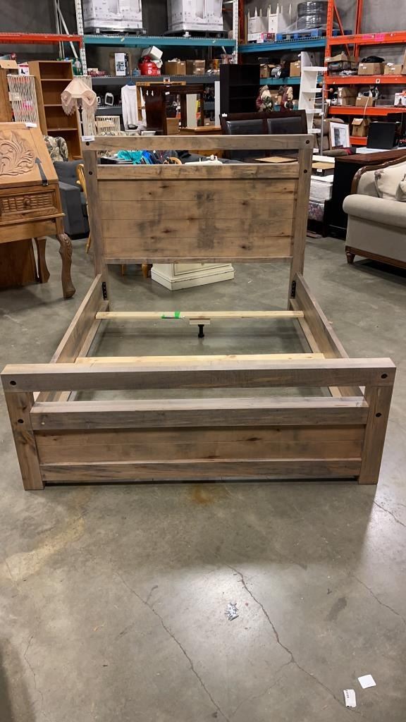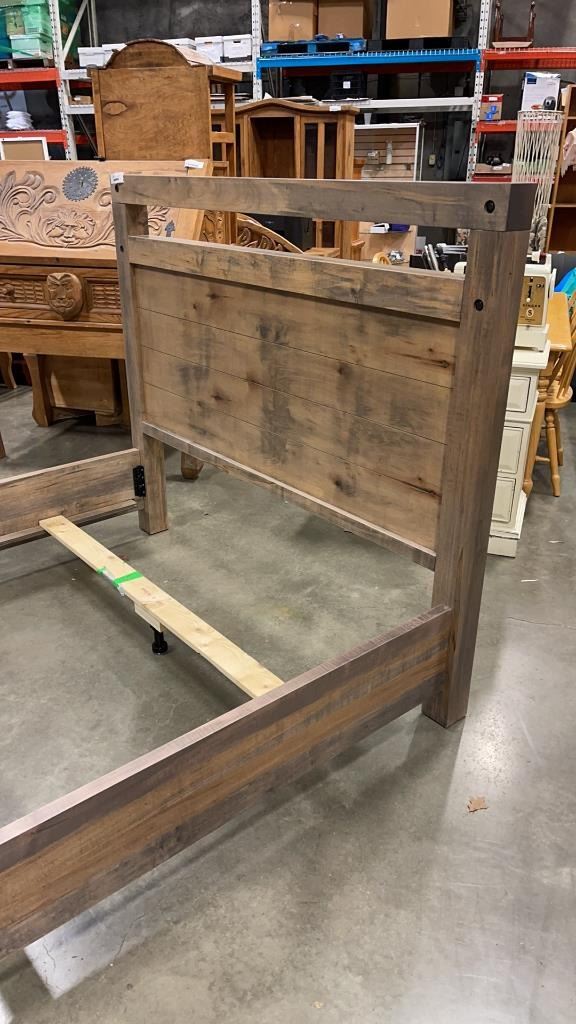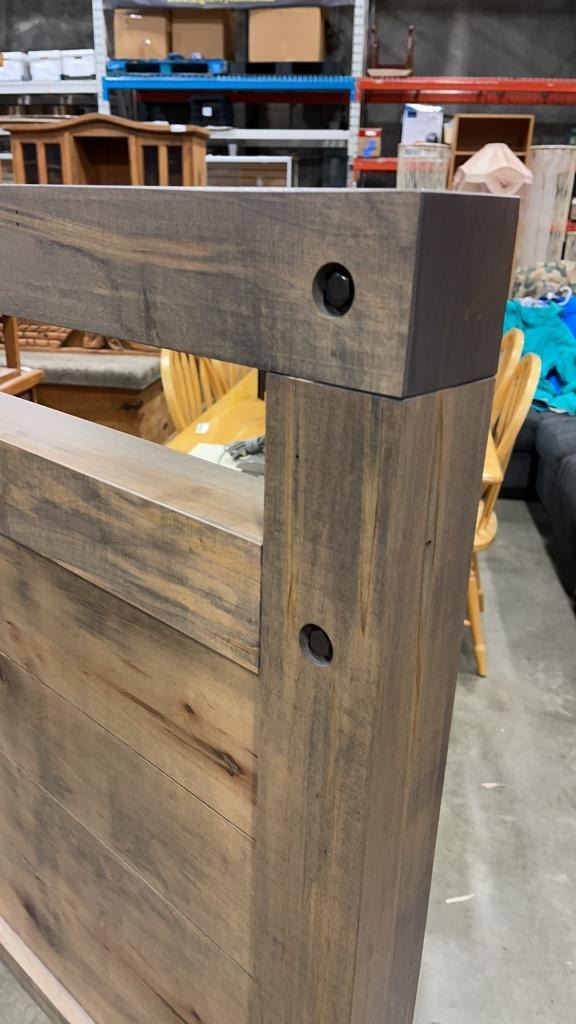 WOODWORKS "HARTLEY BAY" QUEEN SIZE BEDFRAME - CANADIAN BUILT, WEATHERED GREY STAIN , EXCELLENT CONDITION, HEADBOARD 53"H
