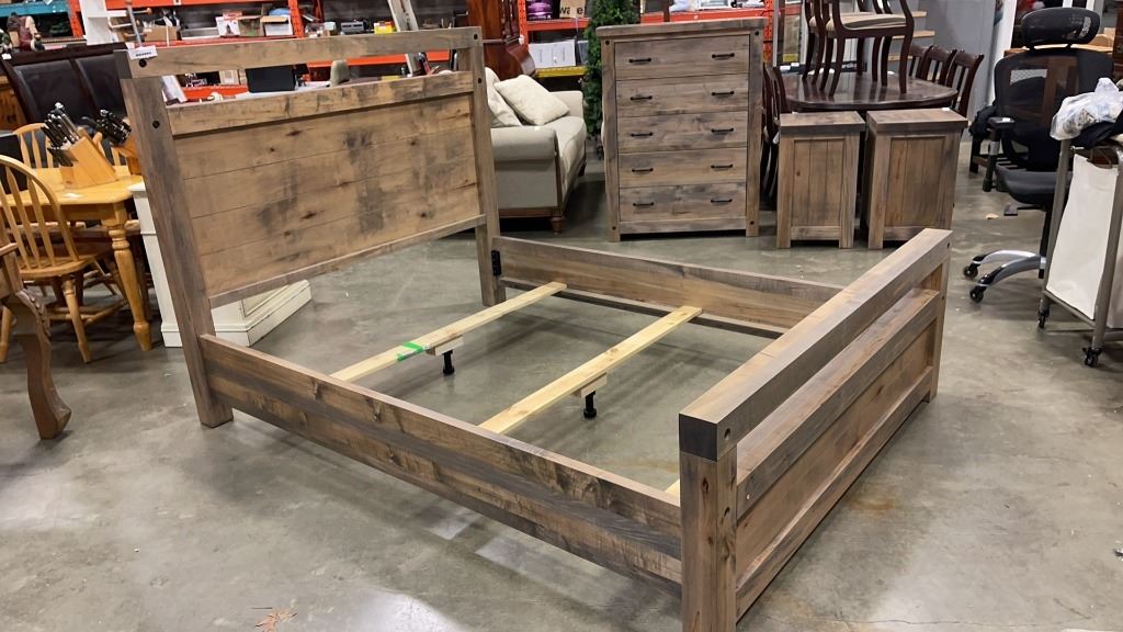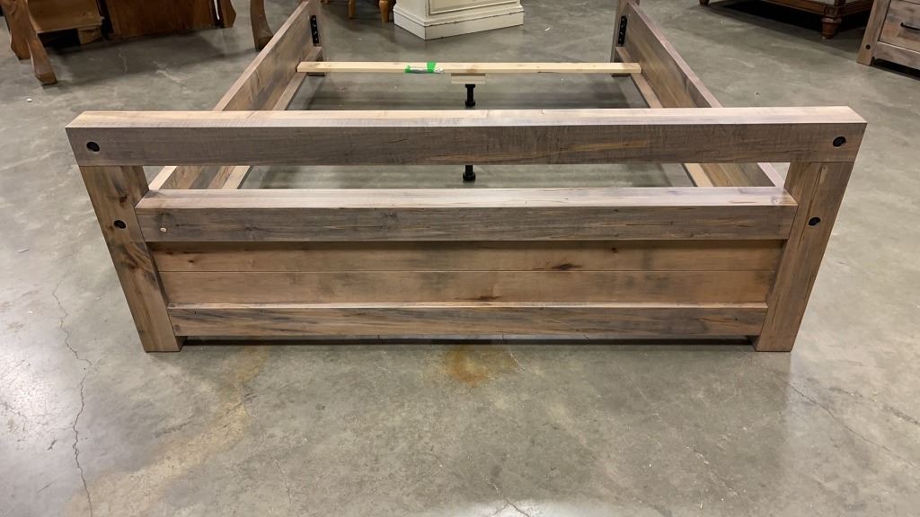 WOODWORKS "HARTLEY BAY" QUEEN SIZE BEDFRAME - CANADIAN BUILT, WEATHERED GREY STAIN , EXCELLENT COND