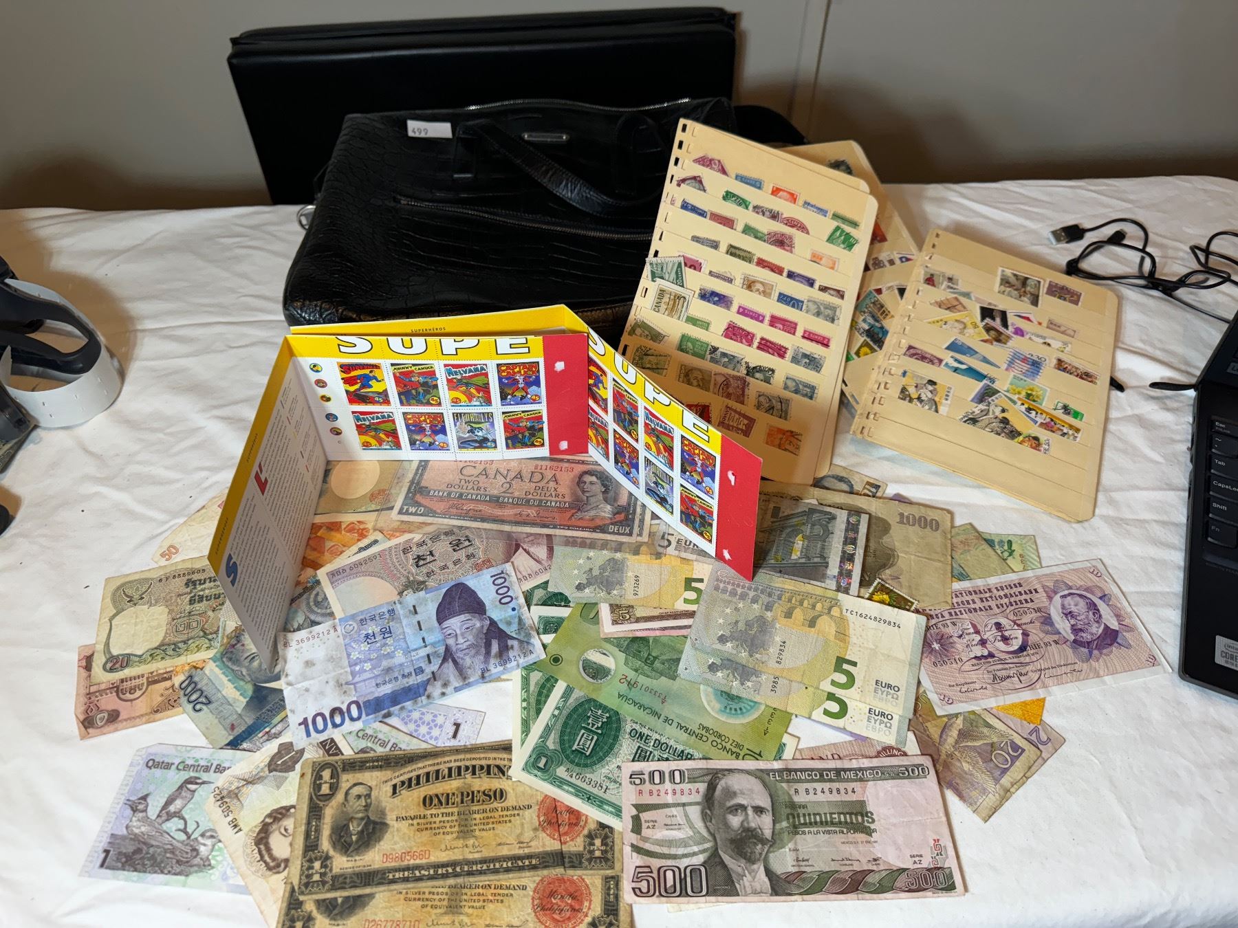 WORLD BANKNOTES, STAMPS AND ST. LAURENT BLACK BAG