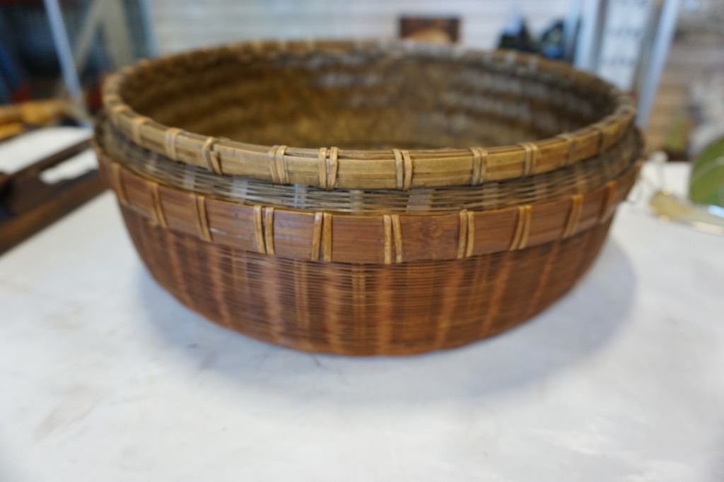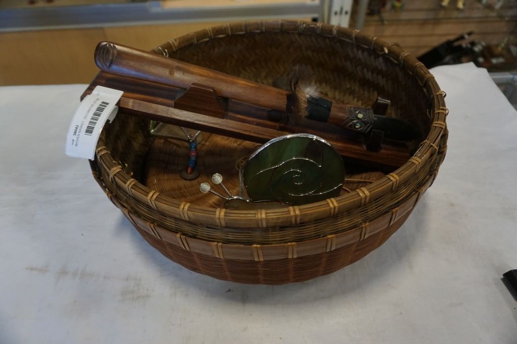 WOVEN BASKET, DECORATIVE STONE BLADE WEAPON AND GLASS ART