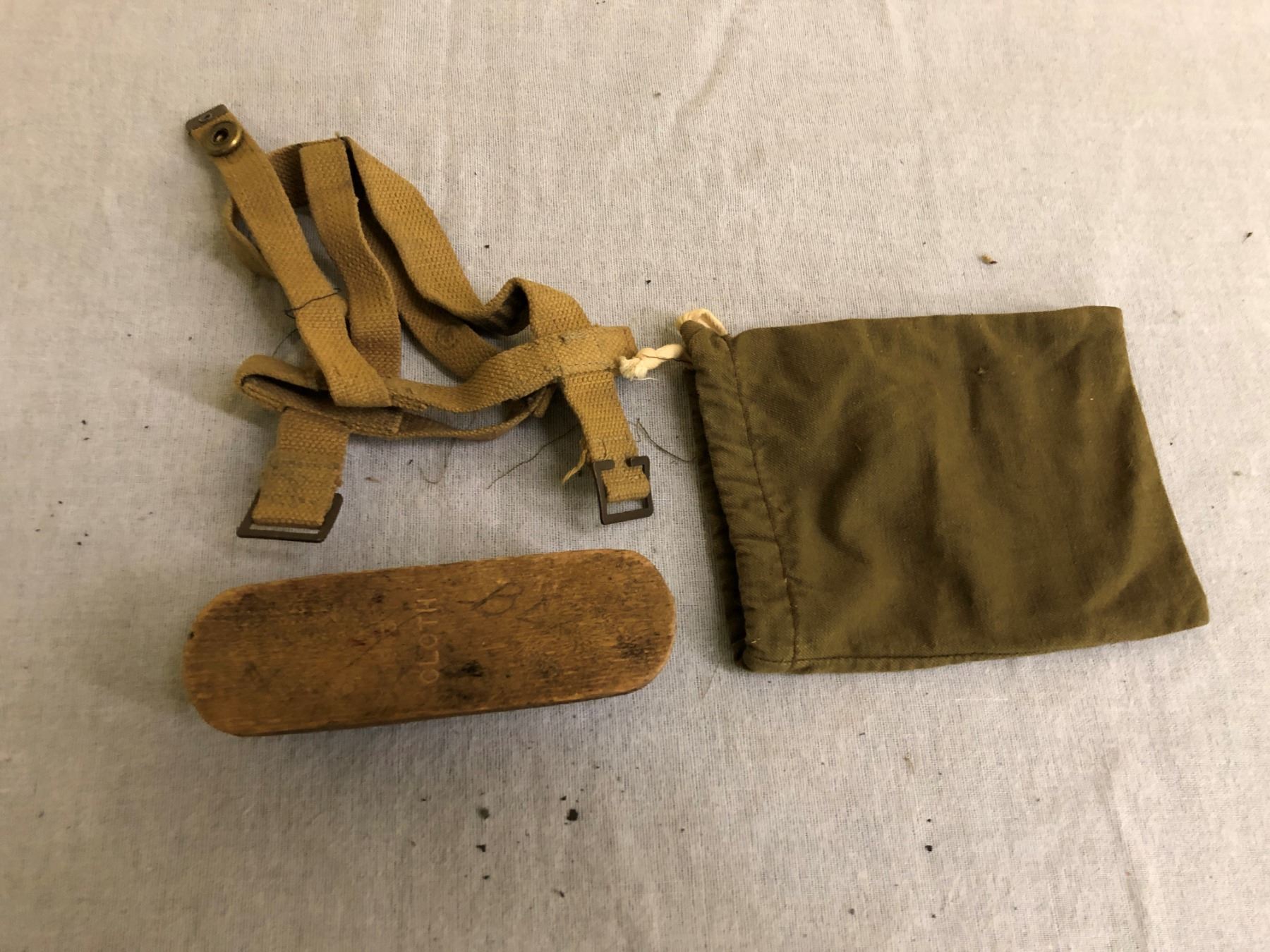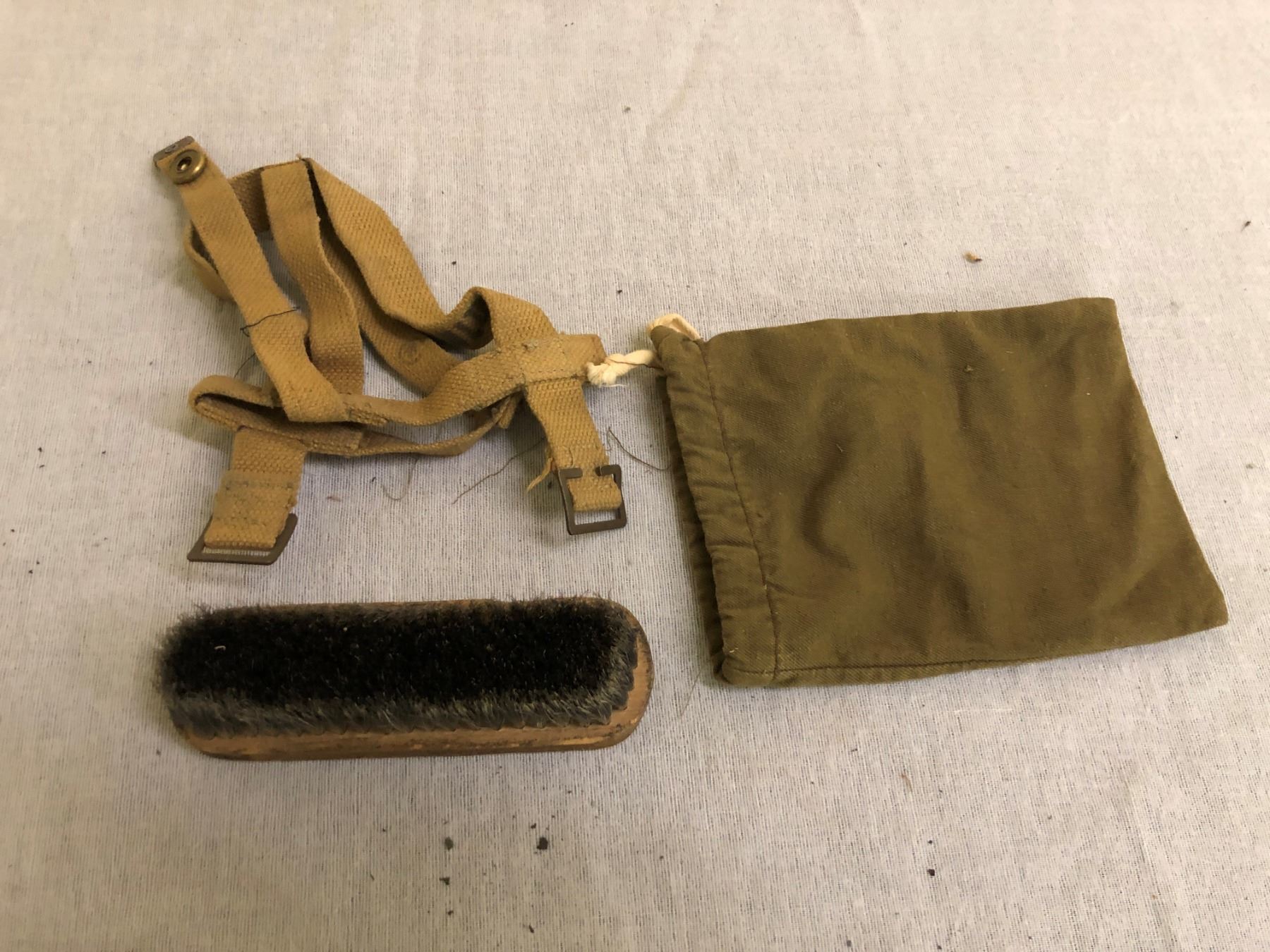 WWII lot of canteen carrier, ditty bag and 1945 dated boot brush