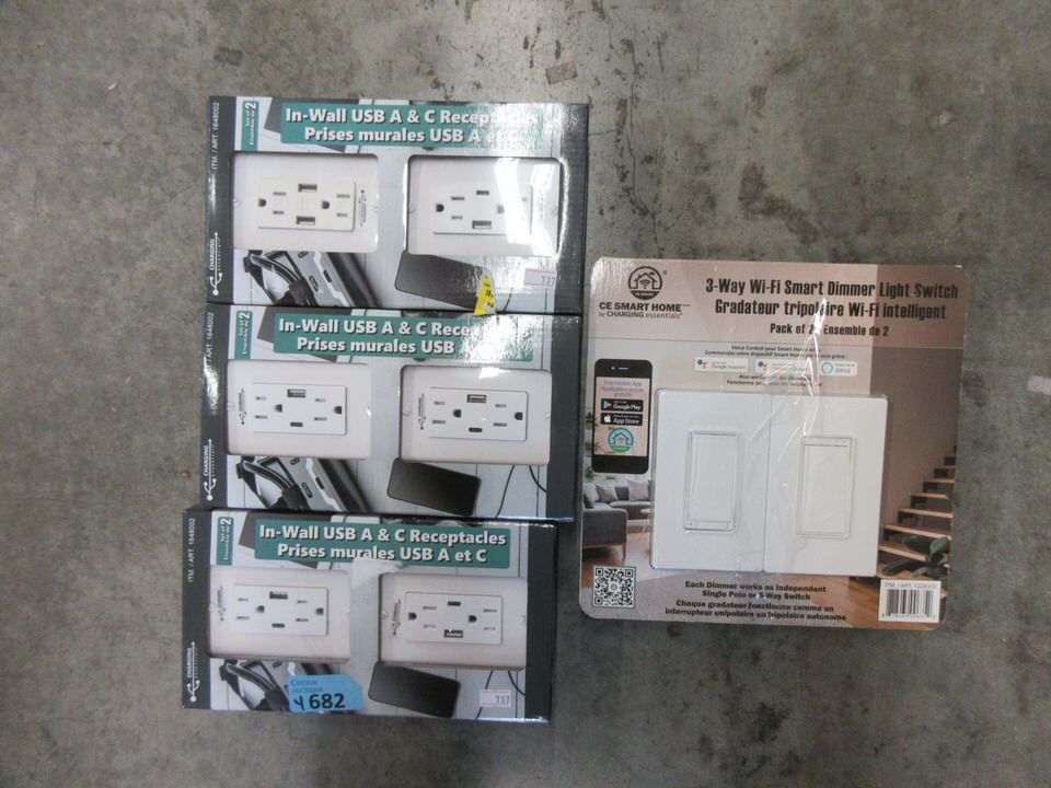 Set of two 3 way smart dimmer switches & 3 sets of 2 in-wall USB A & C receptacles. Open box.