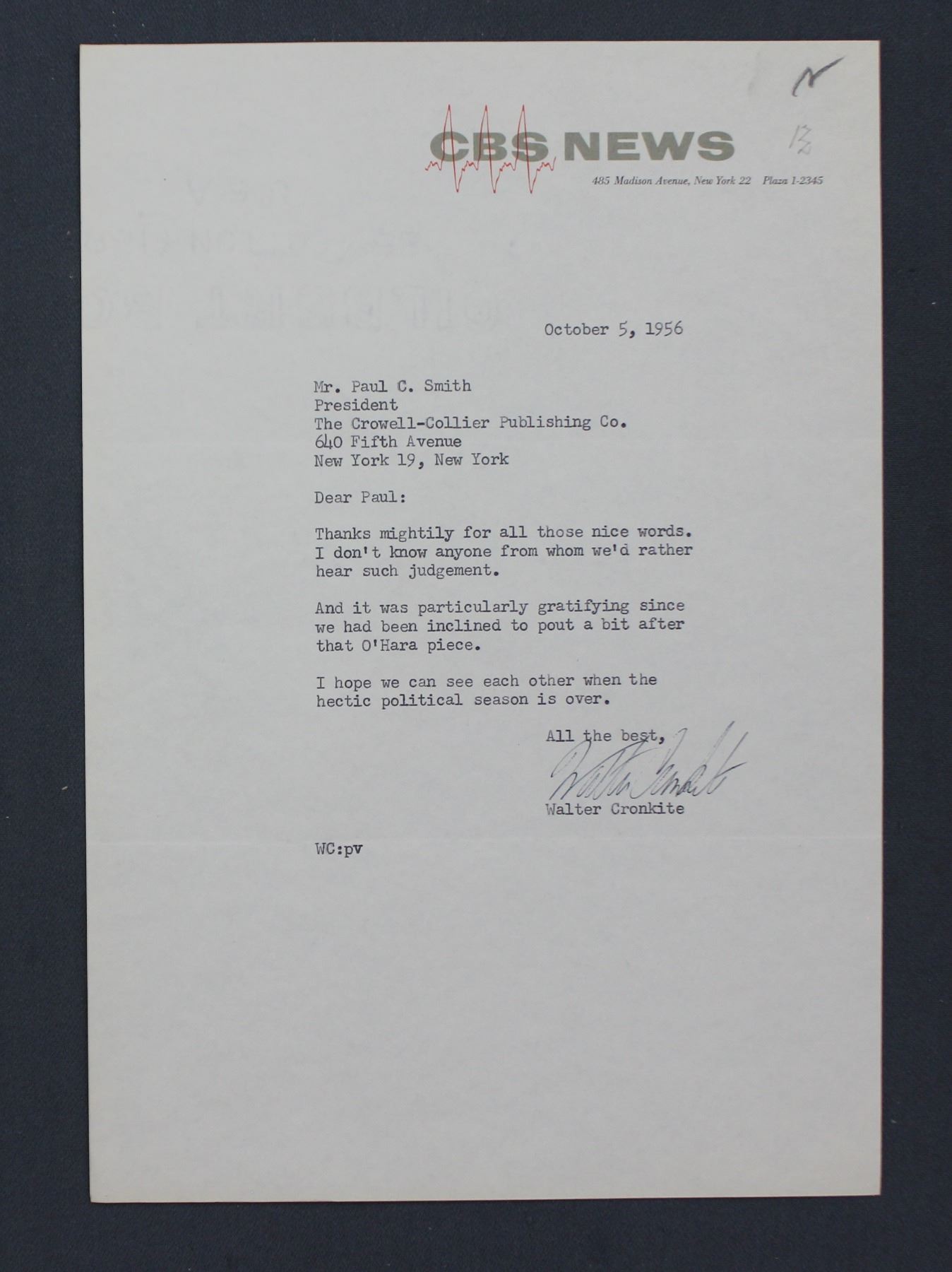 Walter Cronkite Letter Signed as CBS Anchor/Host. One page, 10 1/2" x 7 1/4"; October 5, 1956.