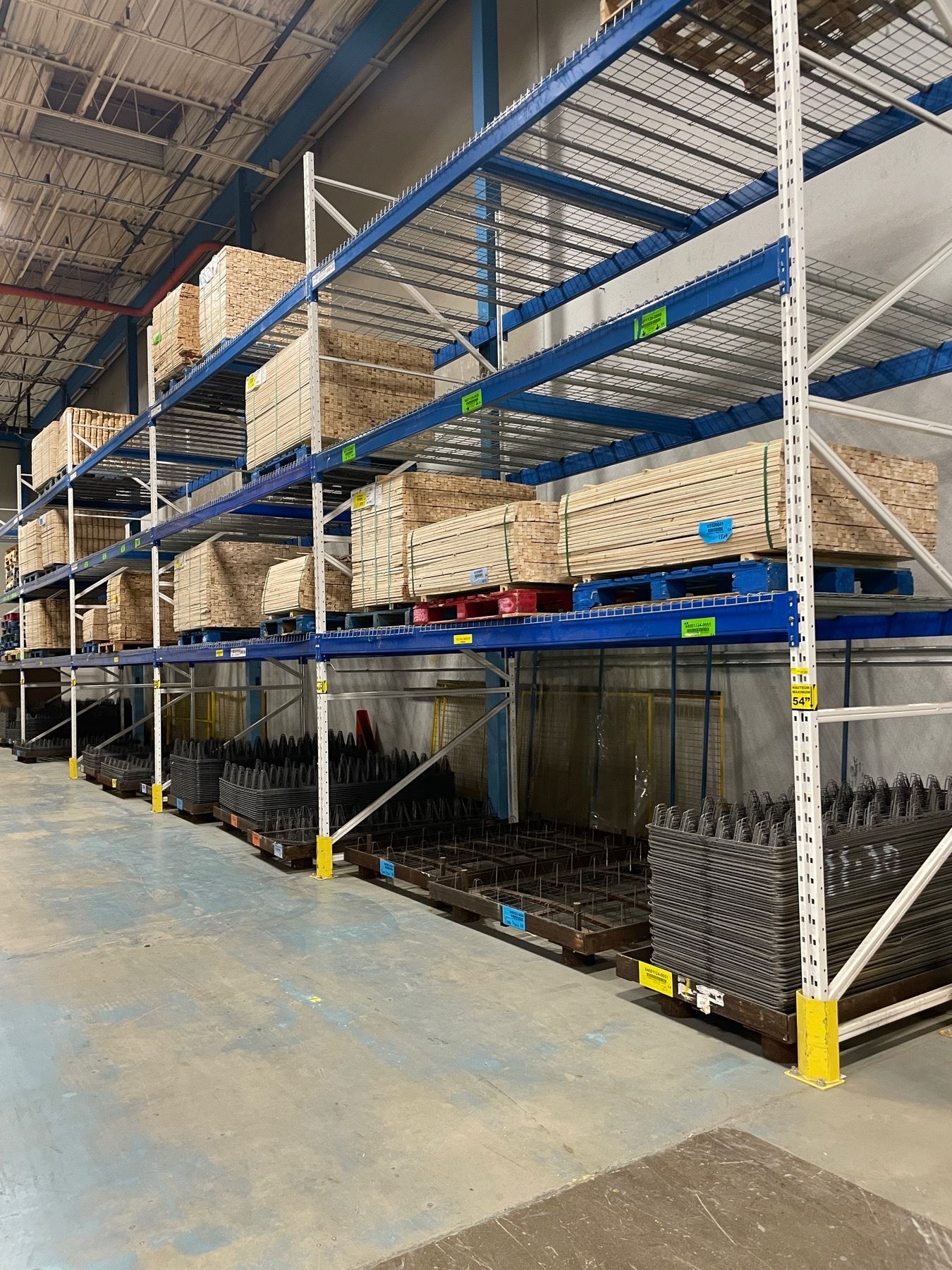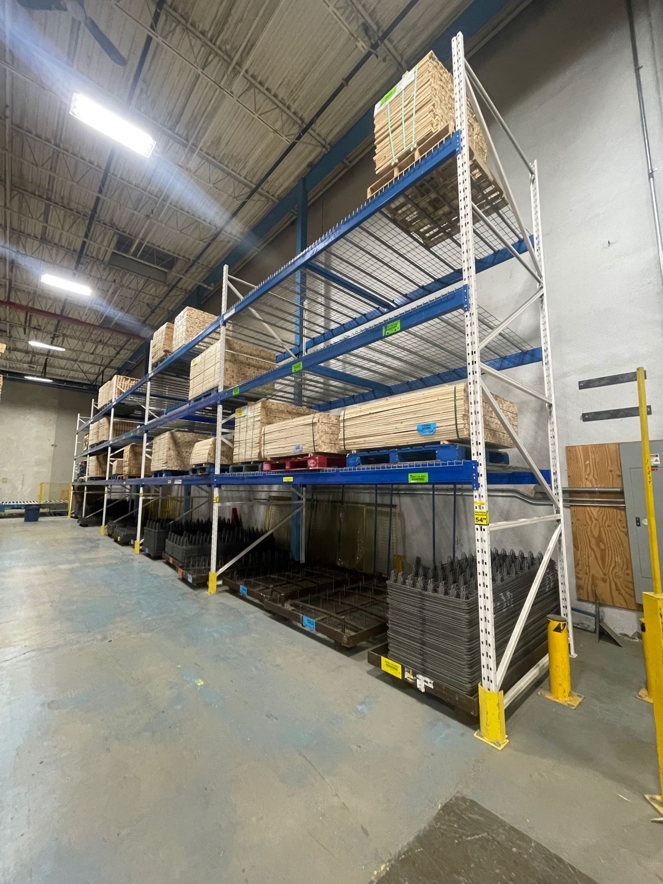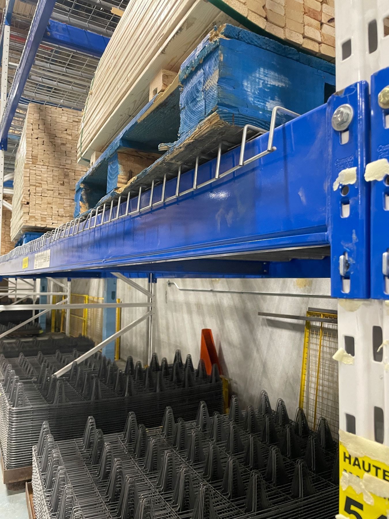 Warehouse Pallet Racking - 5 Sections - 6 Vertical Uprights (approx. 17ft. 3in x 6ft) & 30 horizontal beams (14ft. 4in W x 6in Thickness) w/mesh decking & post protectors