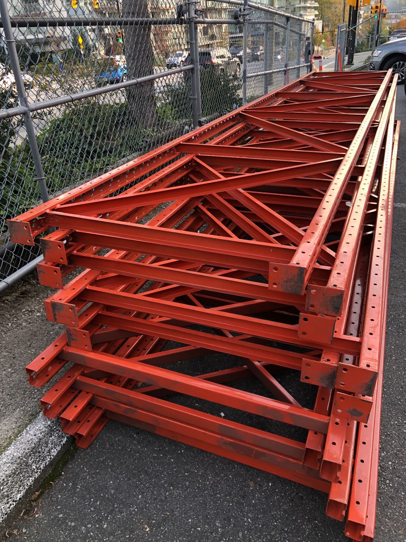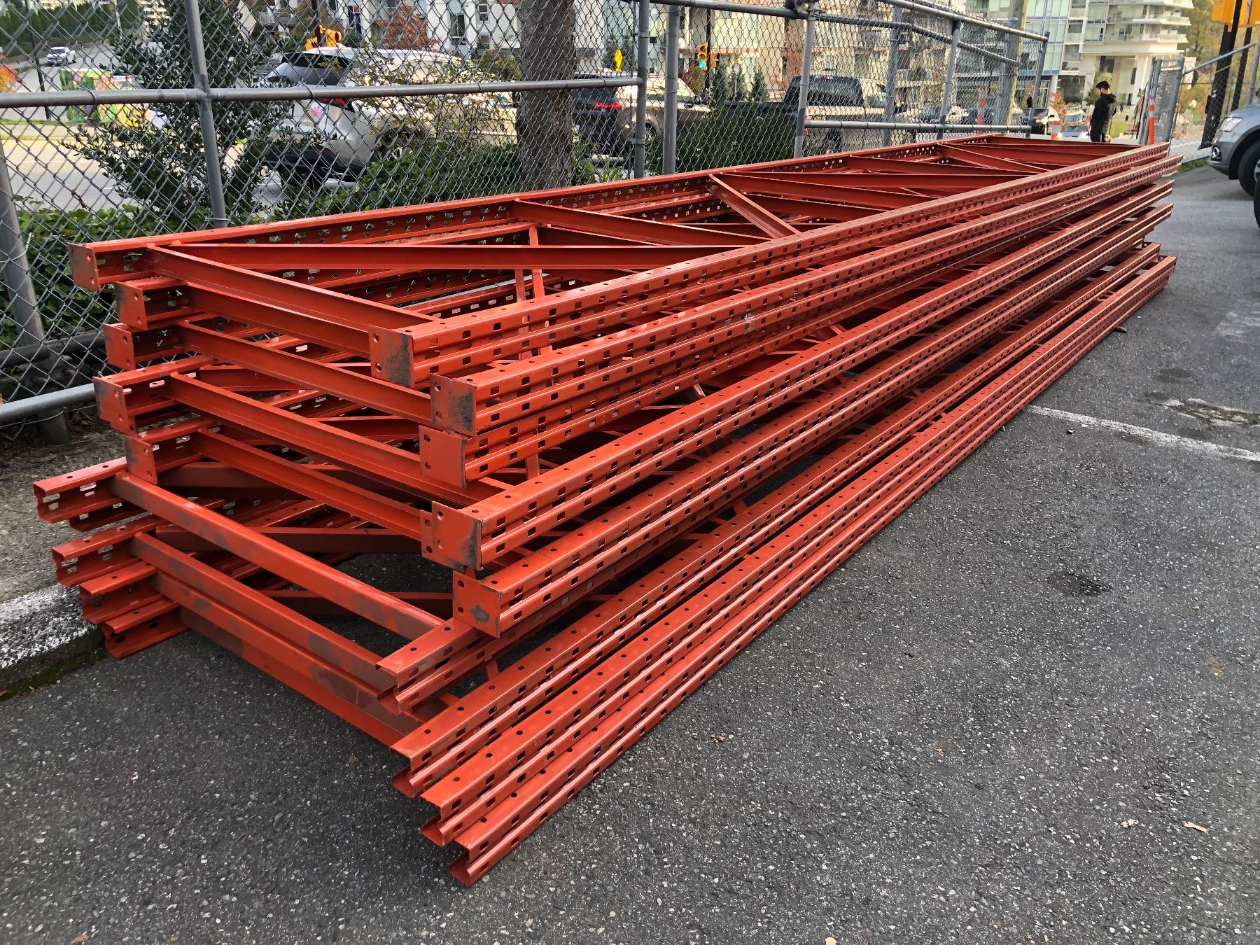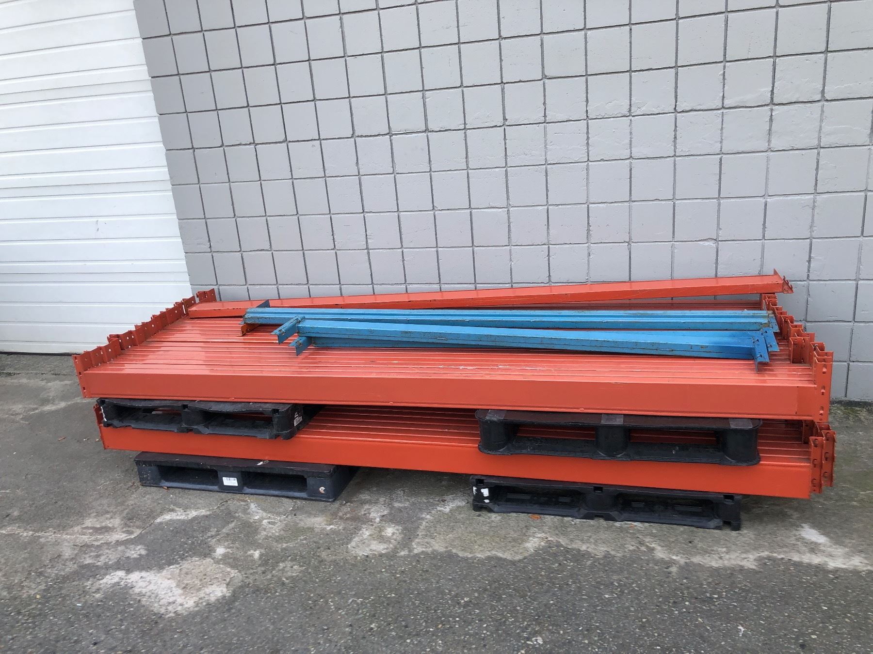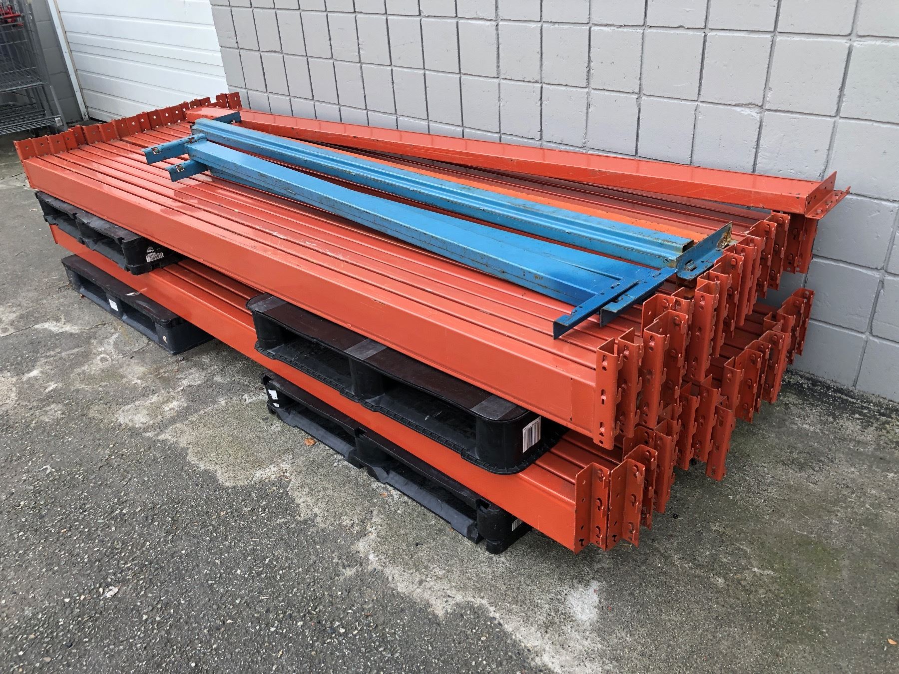 Warehouse pallet racking includes approx. 38 beams 10ft L, 4 beams approx. 6 1/2 ft & 8ft | Approx. 11 vertical uprights approx. 20ft L