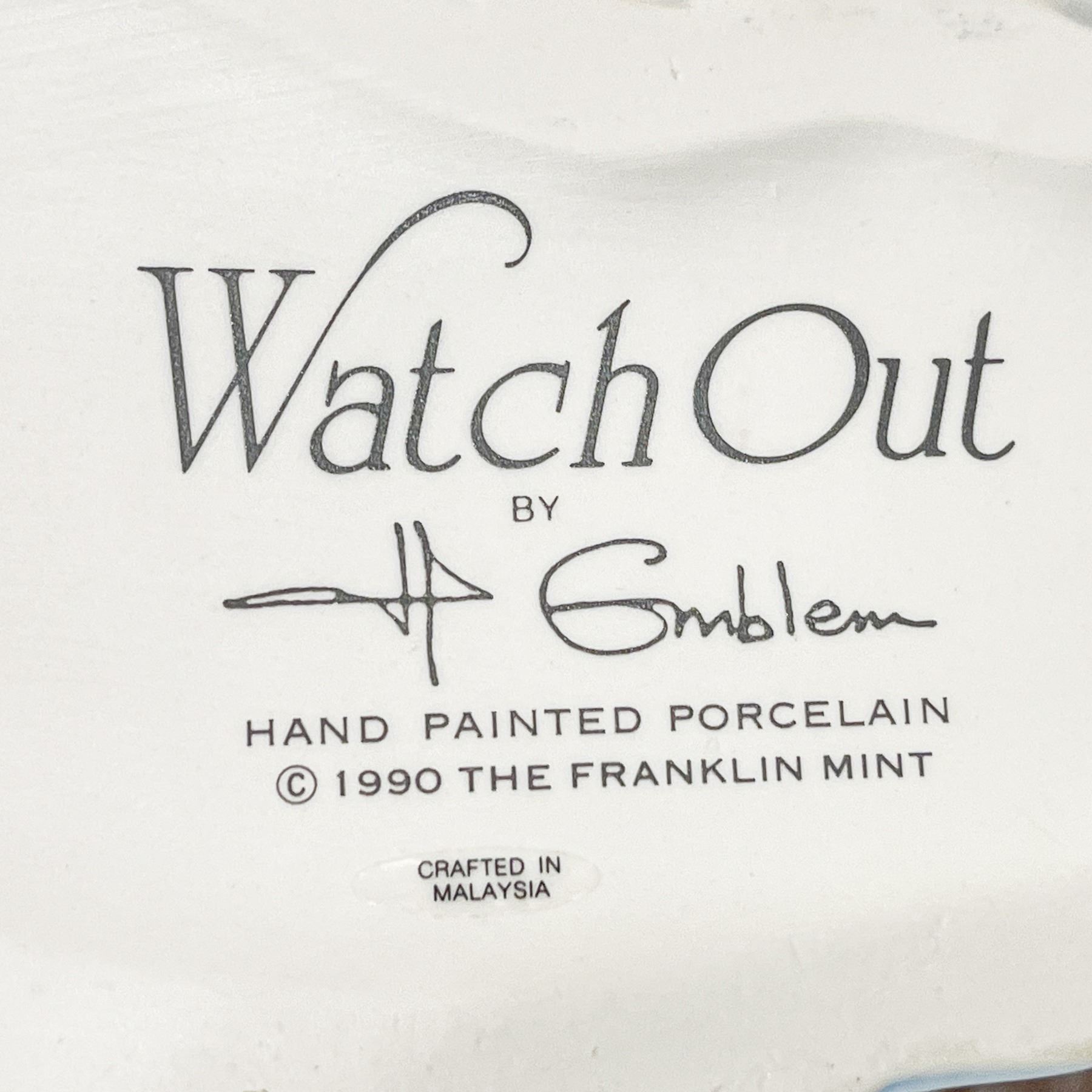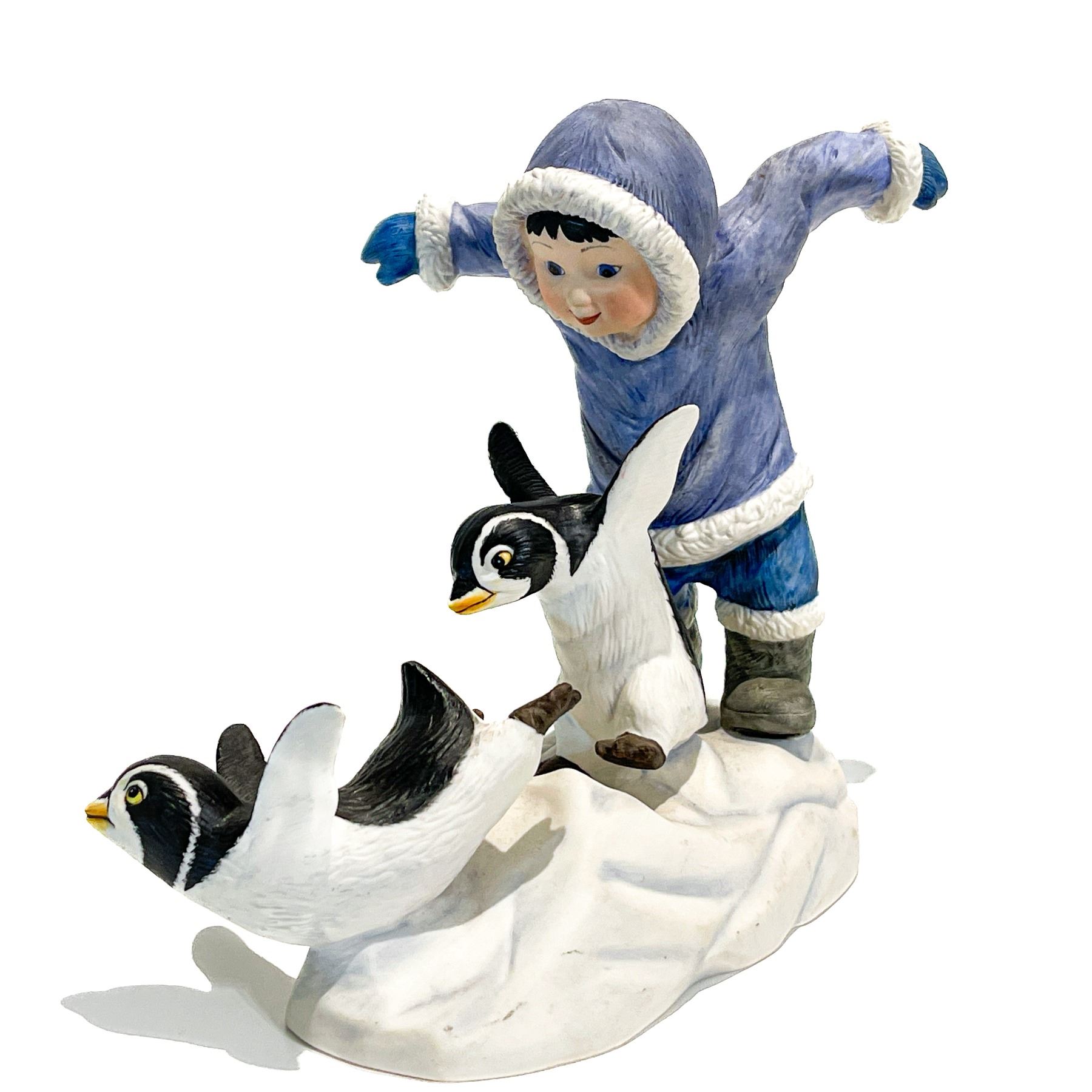 Charming Franklin Mint porcelain figurine titled “Watch Out!” featuring a bundled-up child playing on the snow with two penguins. Expertly hand-painted with fine detailing and soft pastel tones. A delightful collectible that captures playful winter spirit—excellent vintage condition.