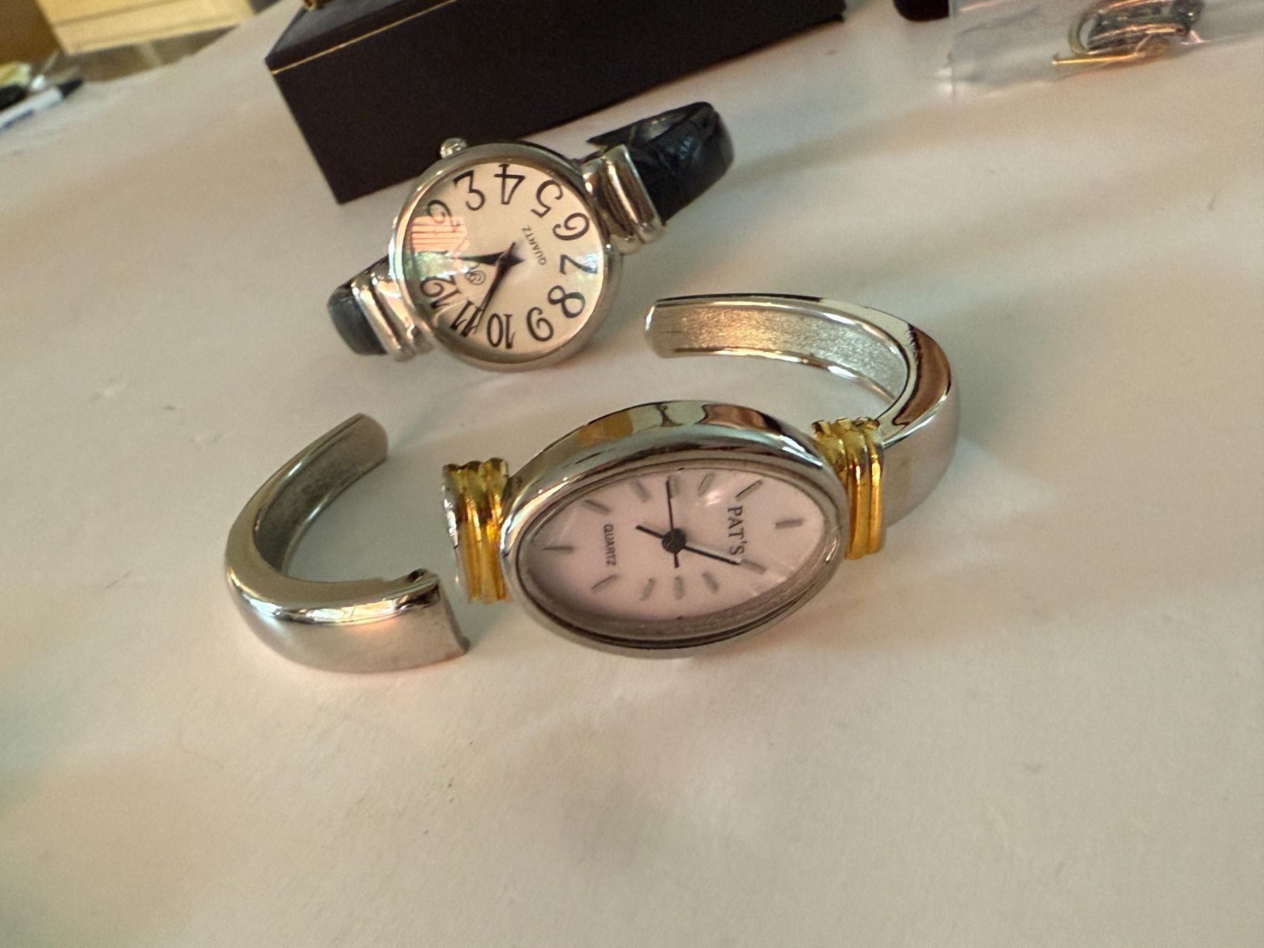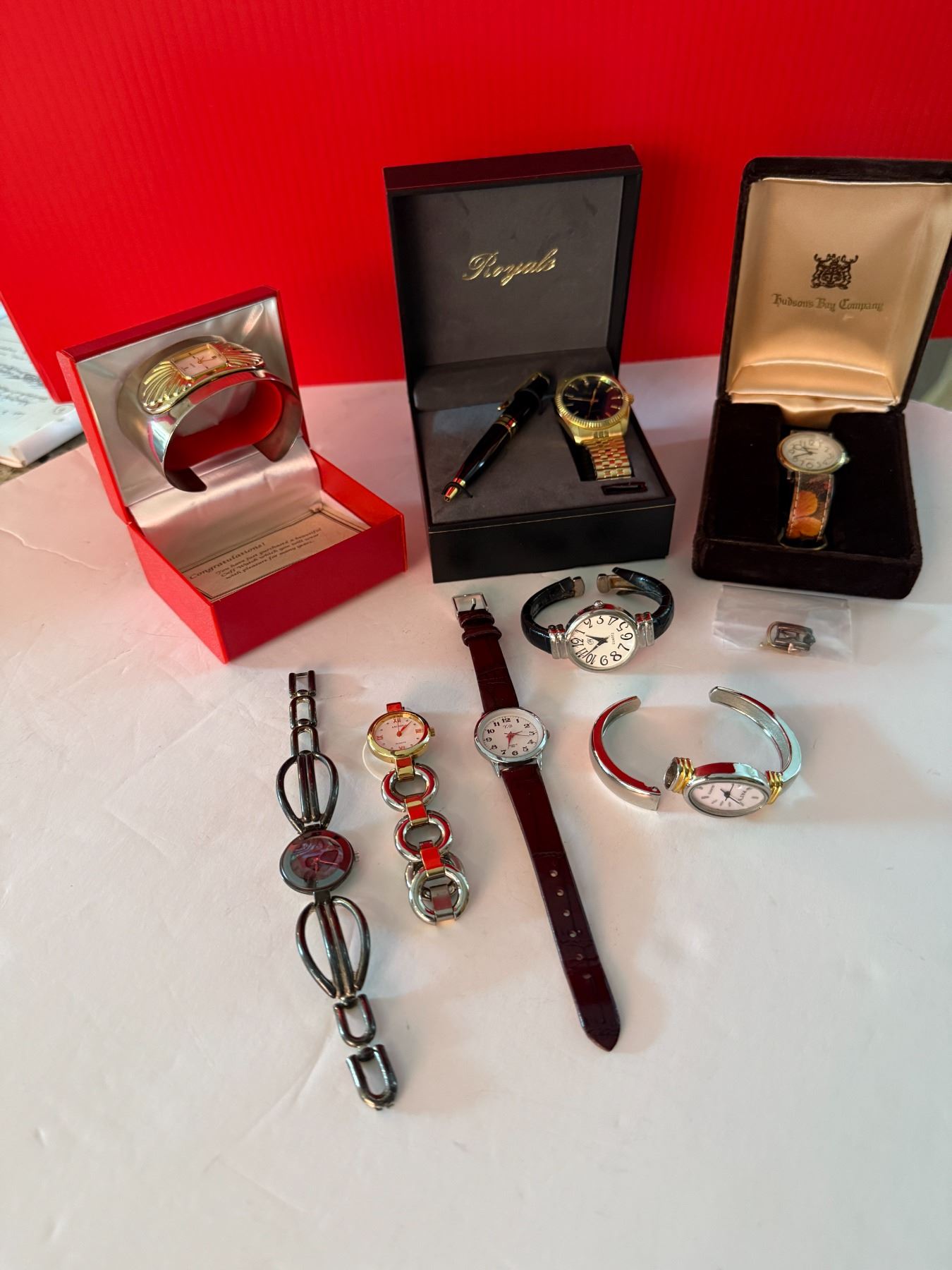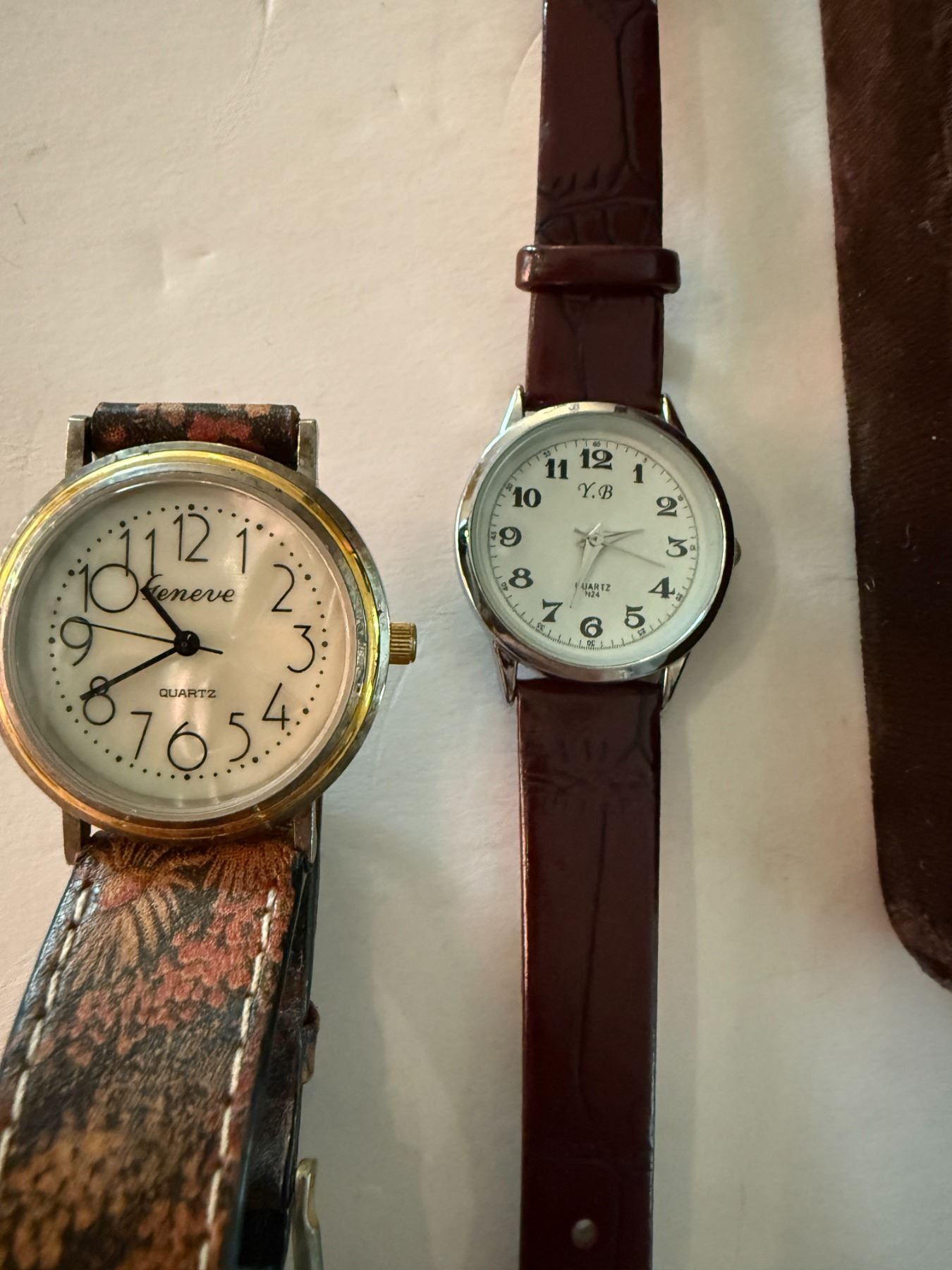 Watches A: Leather straps (2), Axcess by Gruen, Geneve, Royale, Vincci Paris, others. Untested. Some straps need repair.