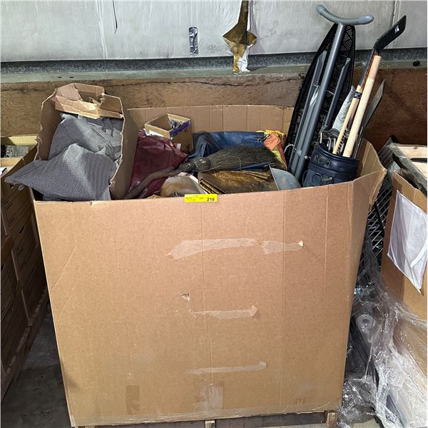 218 - Pallet lot of misc items including - iron board, broom, tarp, iron board, hockey stick, under carpetDirect Liquidation Auction