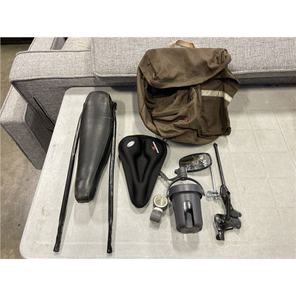 70'S NORCO SADDLE BAG, BANANA SEAT, ASSORTED BIKE ITEMS, KICKSTAND ETC