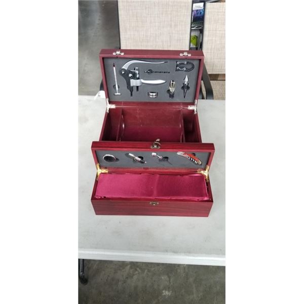 2 BRAND NEW WINE GIFT BOXES - 2 BOTTLE WINE BOX W/ CORKSCREW, BOTTLE STOPPER, POURER, THERMOMETER, AND DRIP RING, AND SINGLE BOTTLE HOLDER W/ CORKSCRE