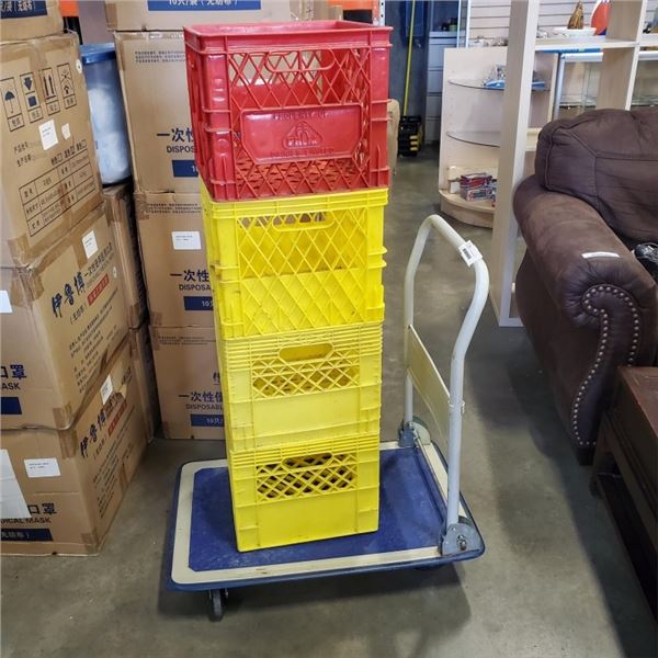 BLUE FOLDING DOLLY AND 4 MILK CRATES