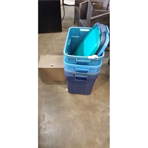 4 TOTES W/ LIDS AND METAL BIN