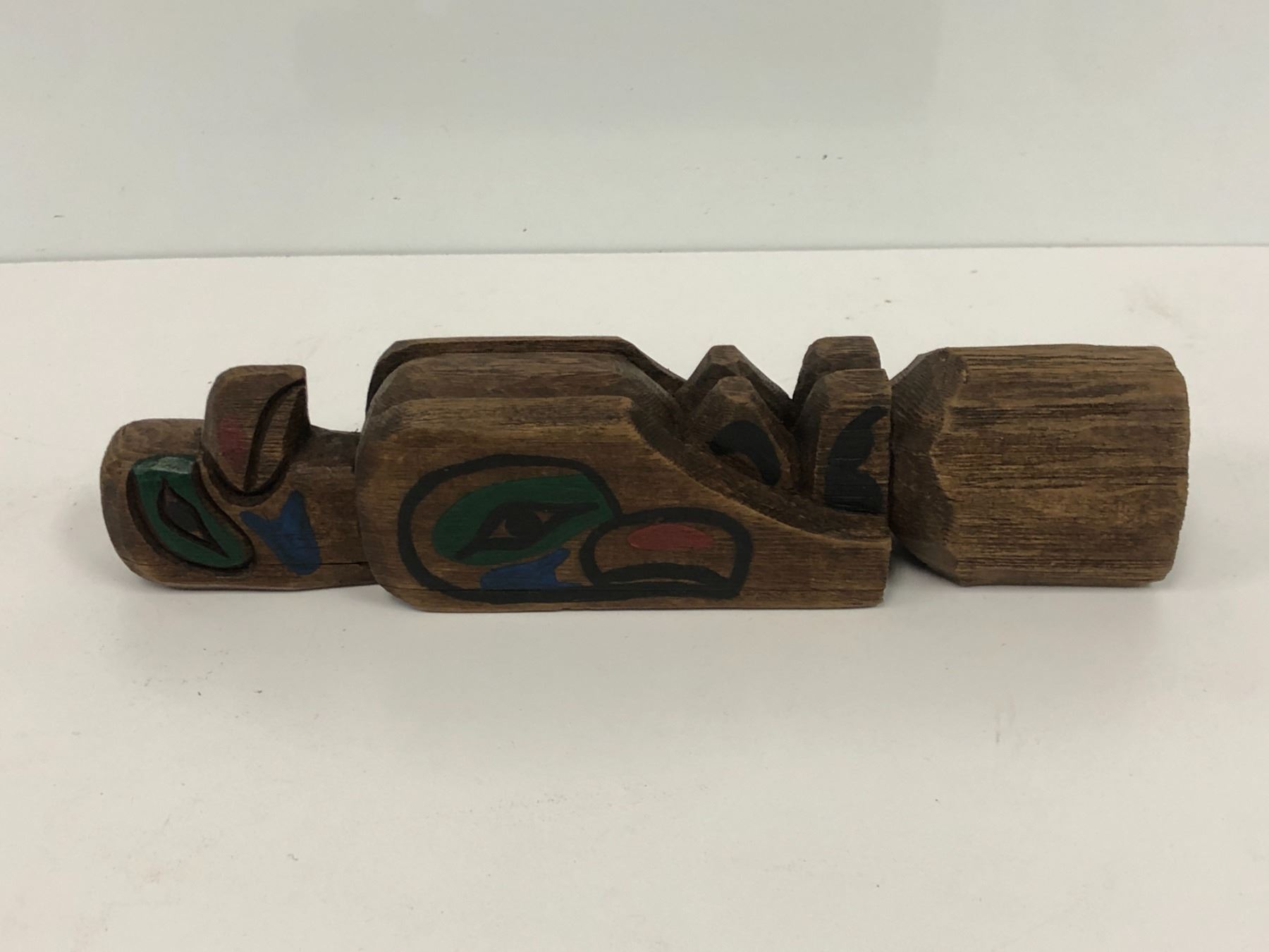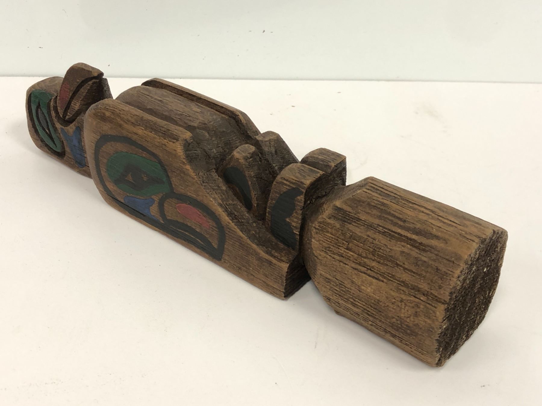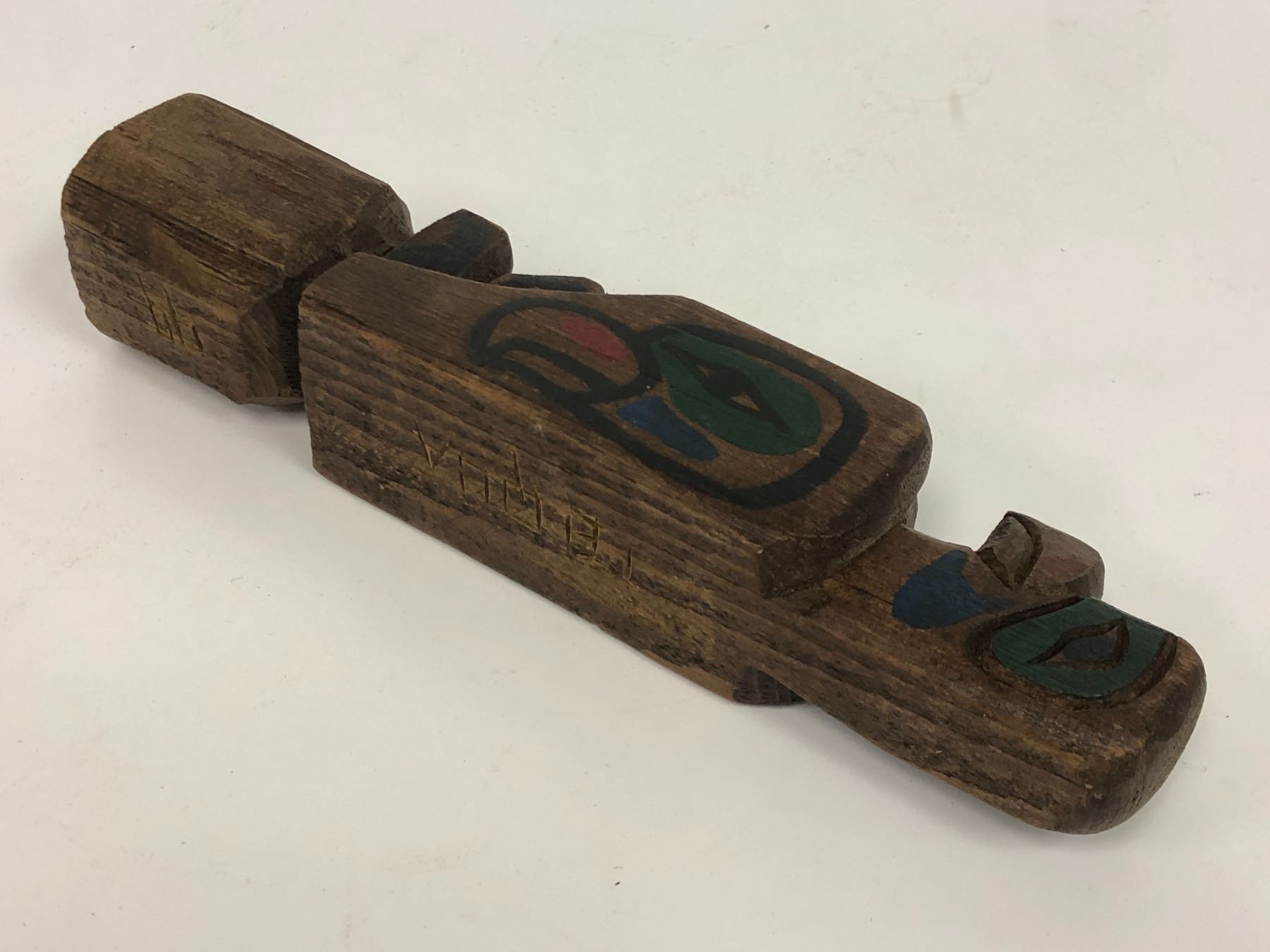 West Coast First Nations carved wooden 8in "Eagle & Raven" rattle signed Telqua 1999