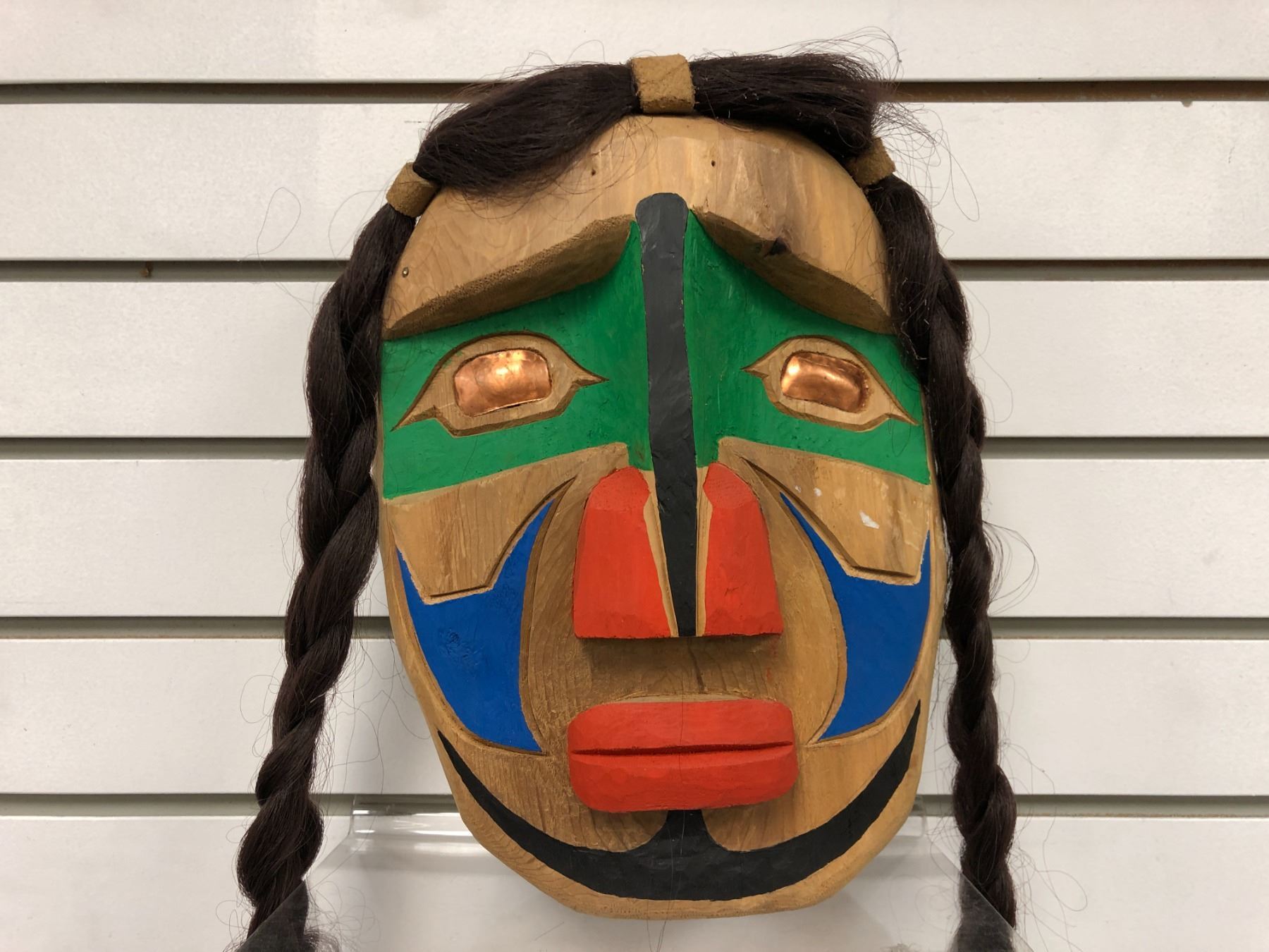 West Coast First Nations carved wooden face mask w/ authentic looking hair & copper eye accents signed Telqua 1999 - approx. 12in x 9in