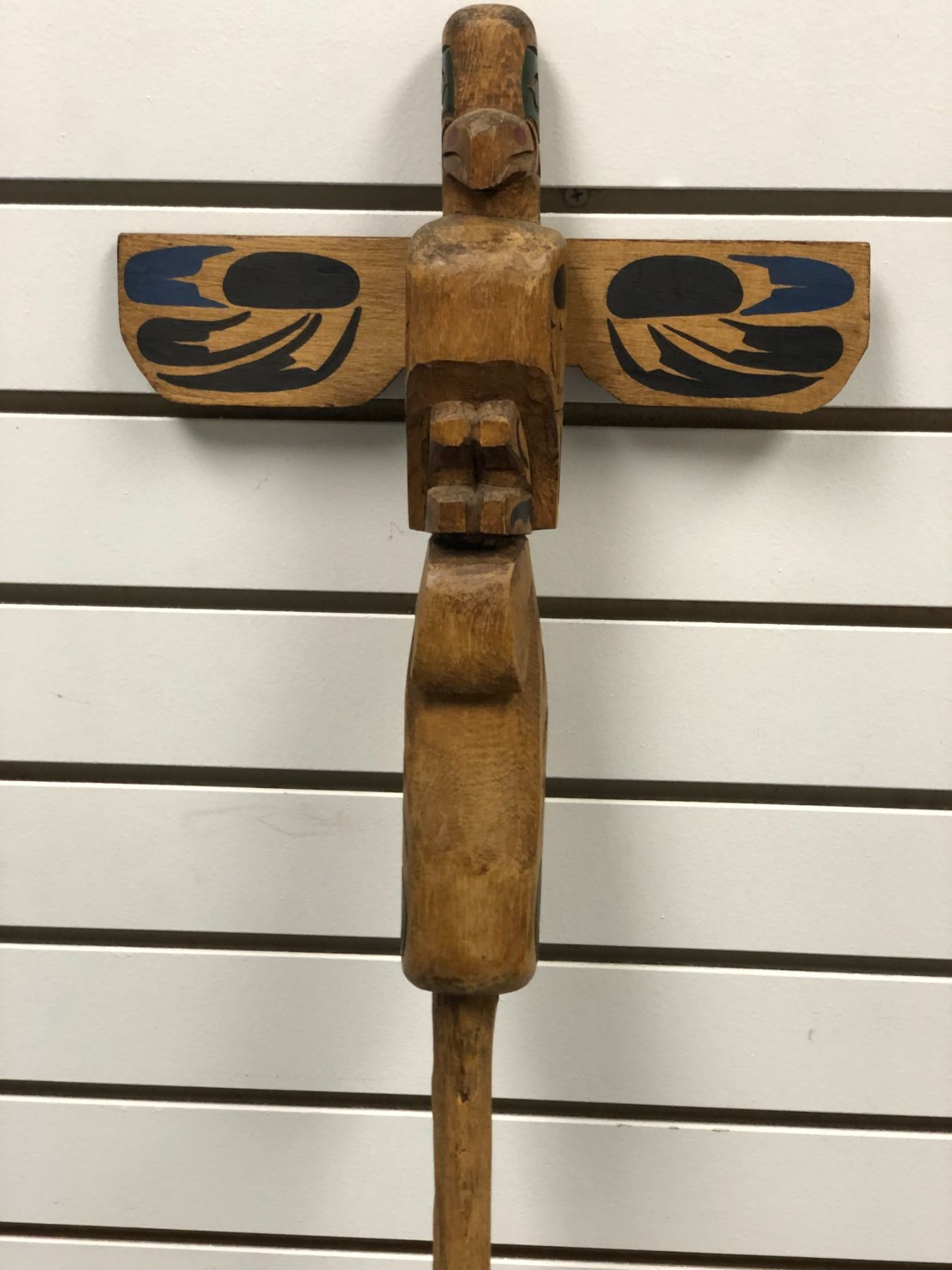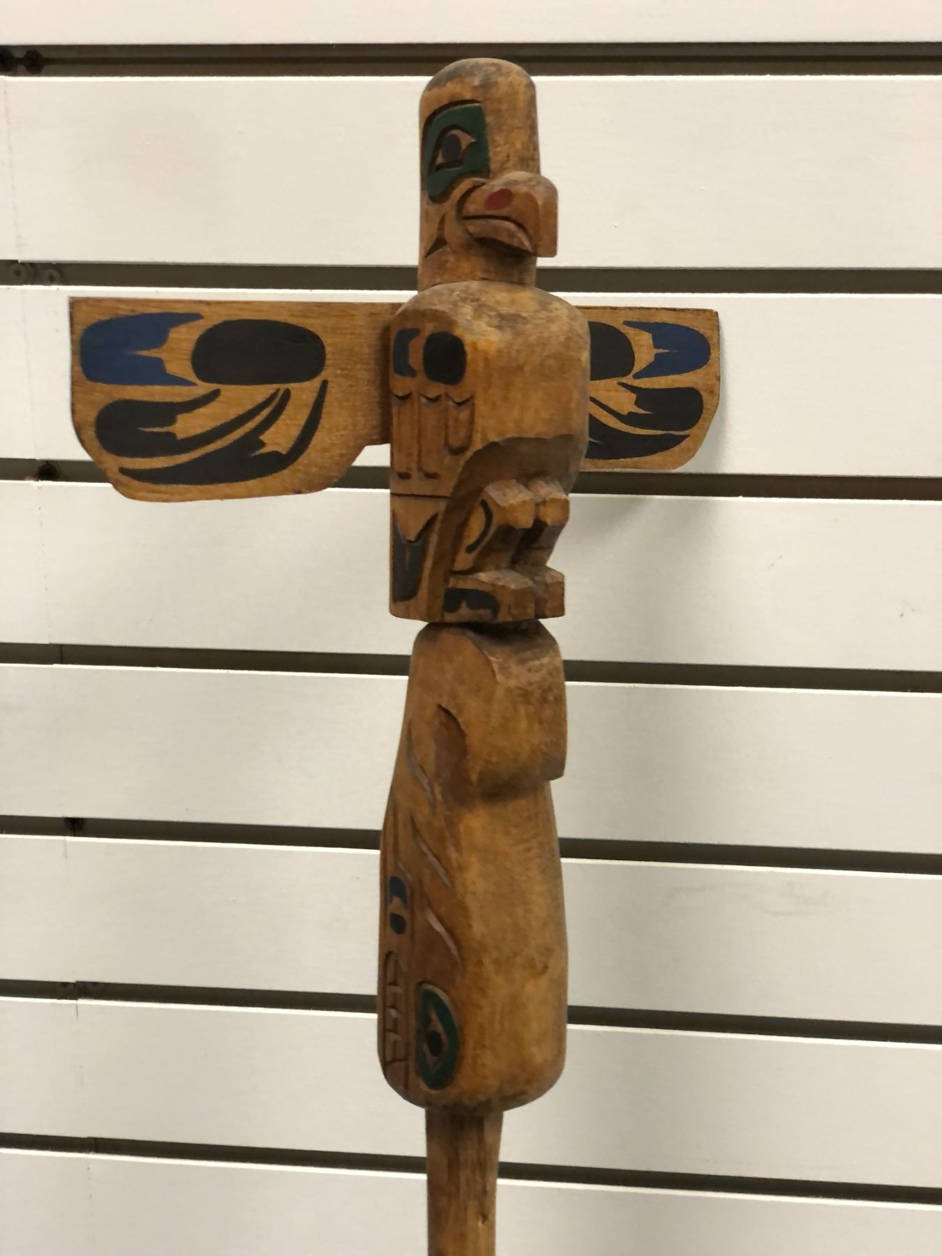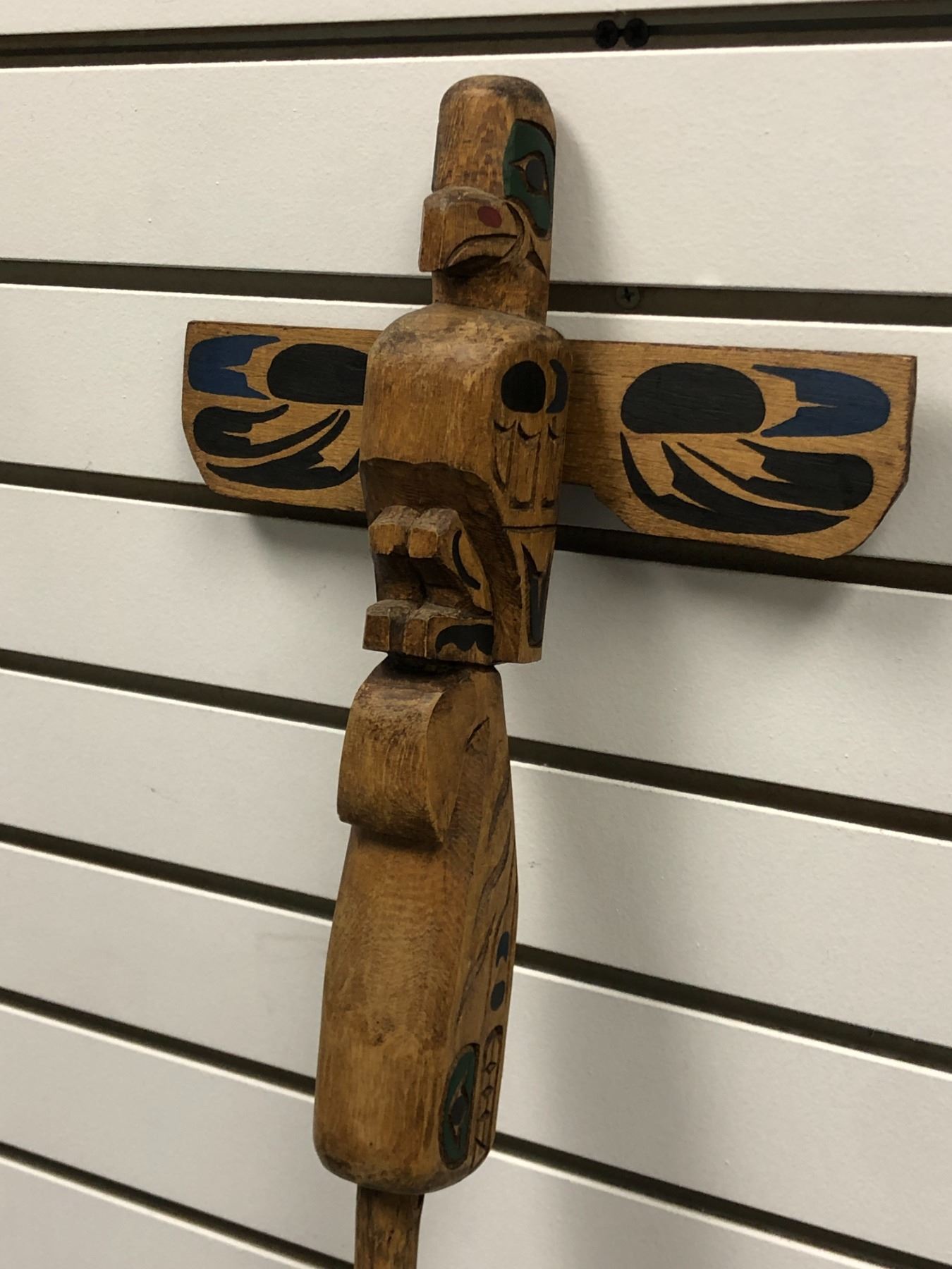 West Coast First Nations carved wooden talking stick "Eagle & Killer Whale" signed Telqua 1999 - 48 1/2in