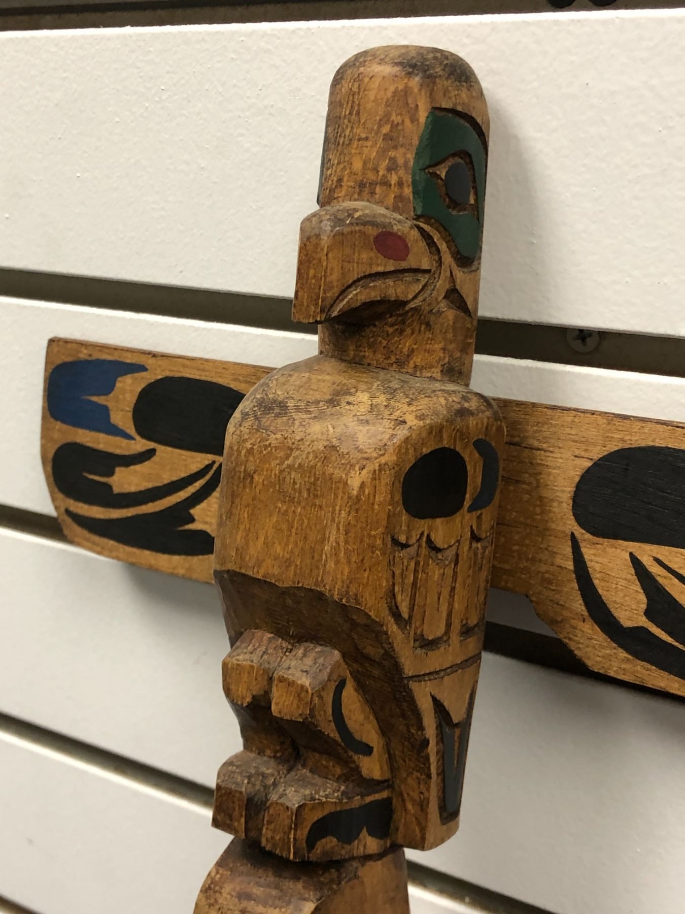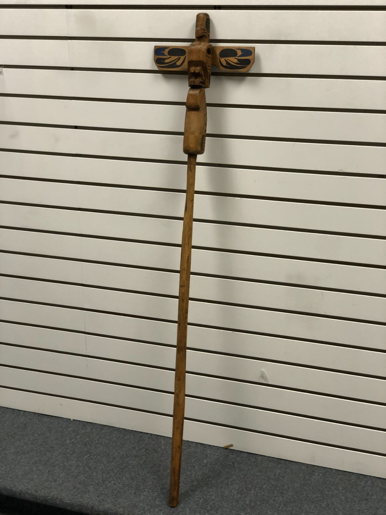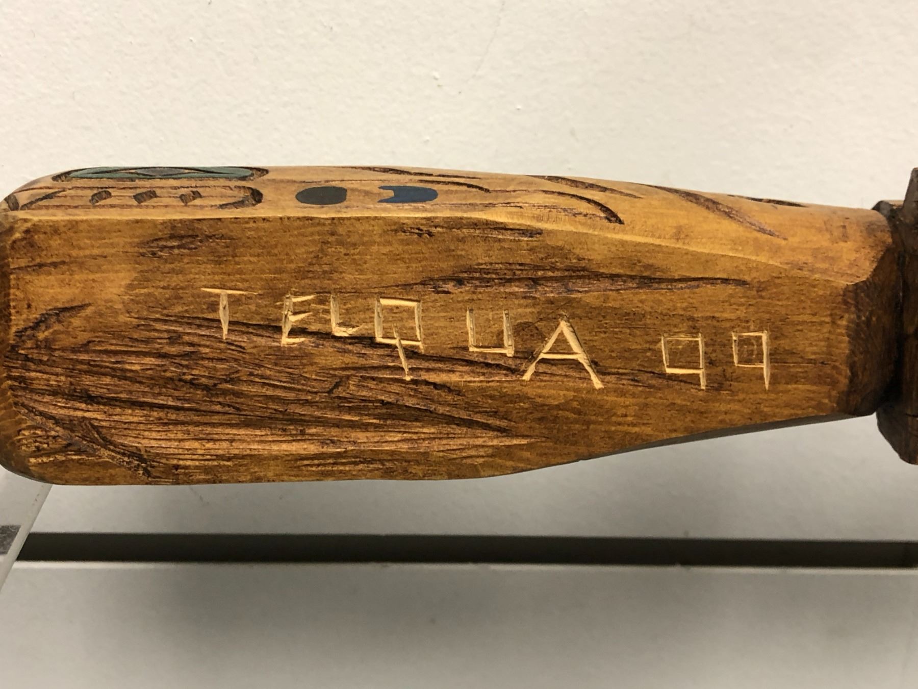 West Coast First Nations carved wooden talking stick "Eagle & Killer Whale" signed Telqua 1999 - 48 1/2in