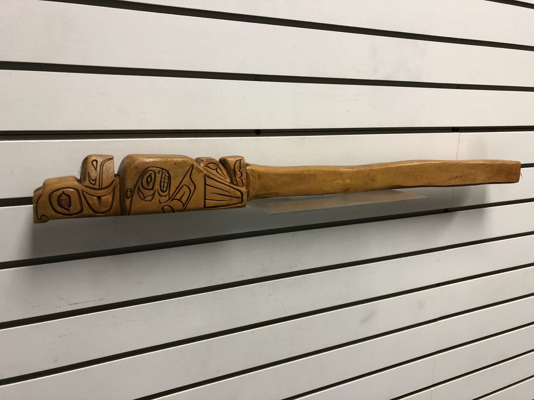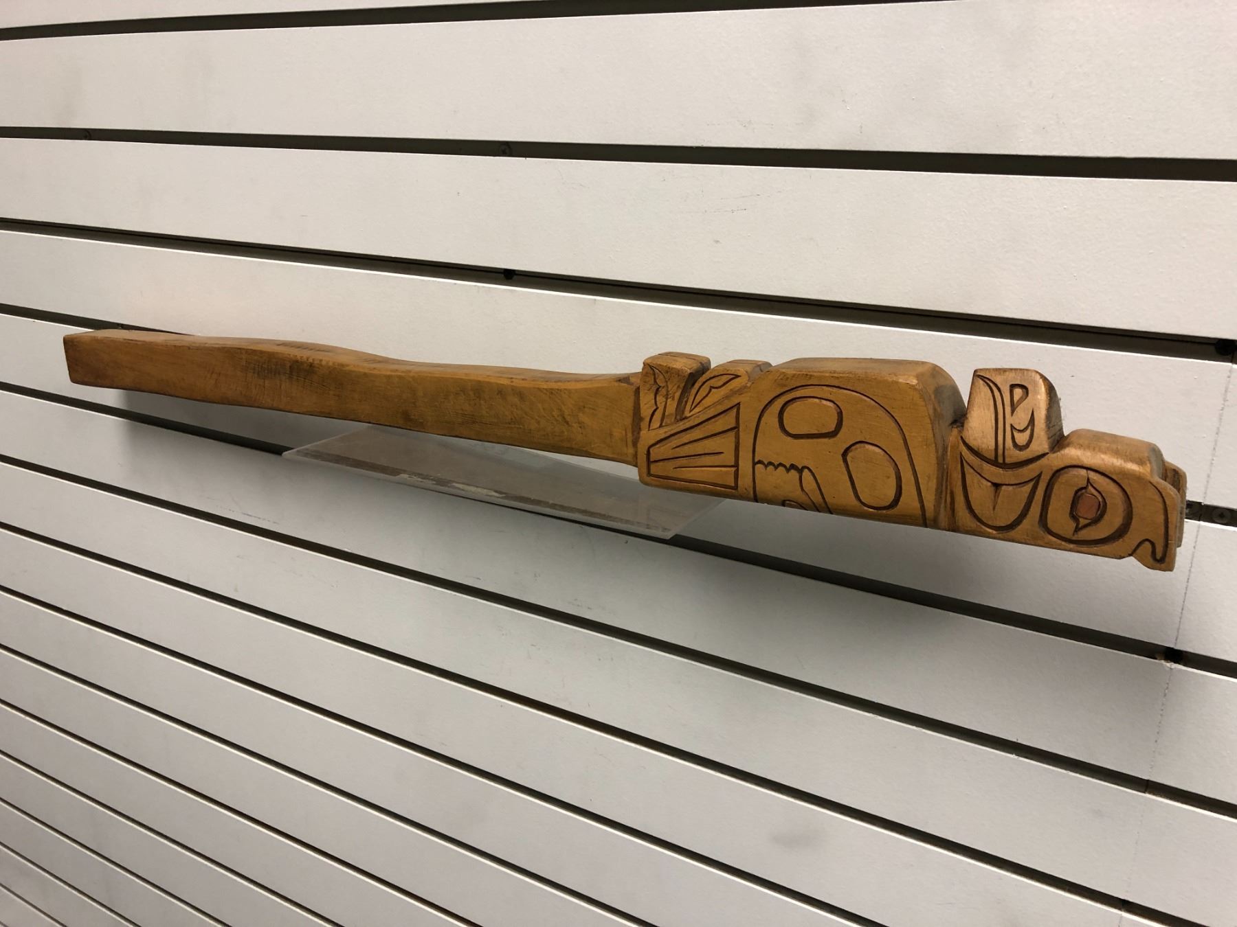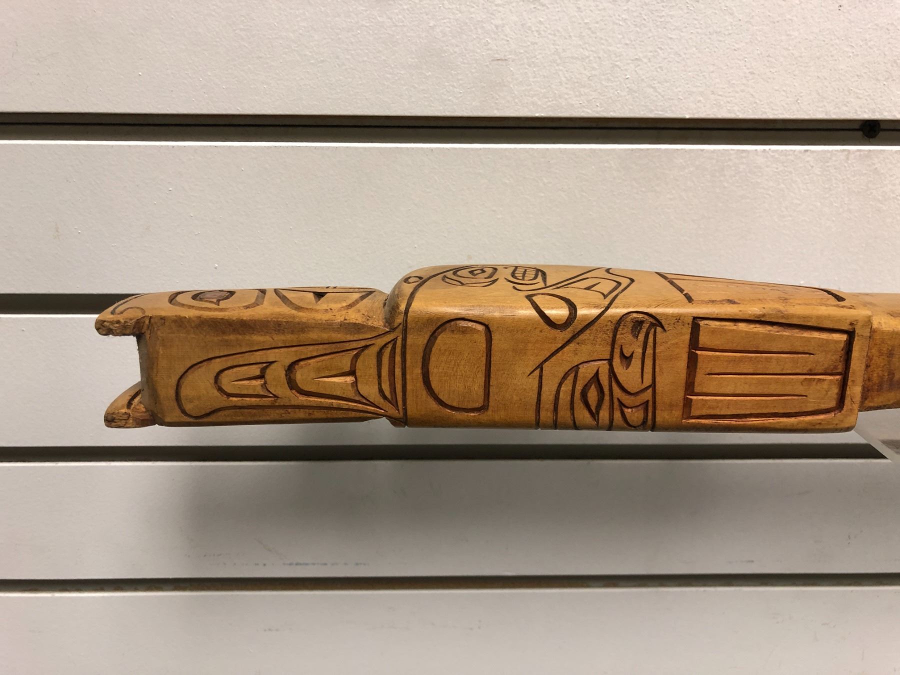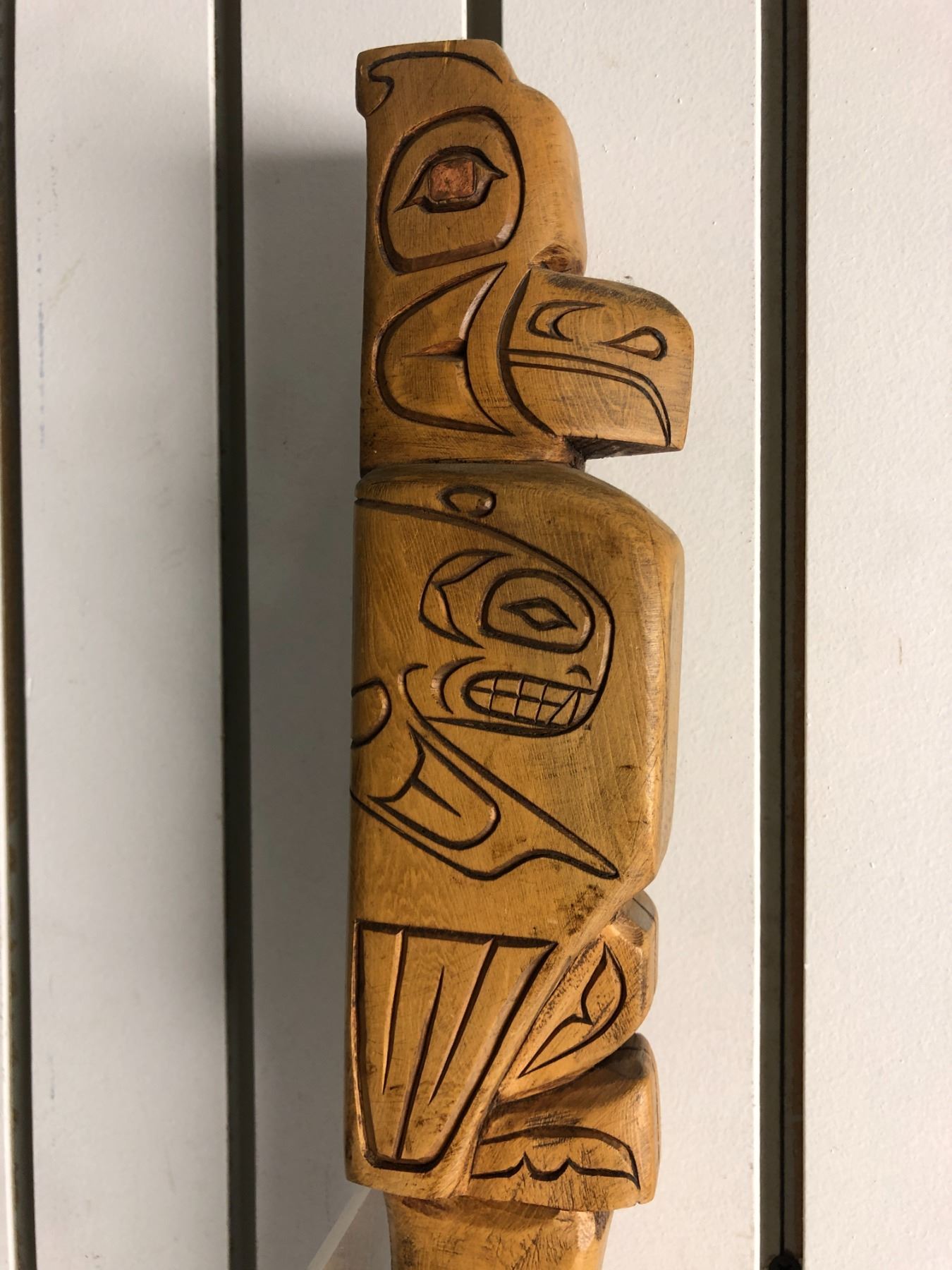 West Coast First Nations carved wooden talking stick "Eagle & Killer Whale" w/ copper eyes - 30 1/2in
