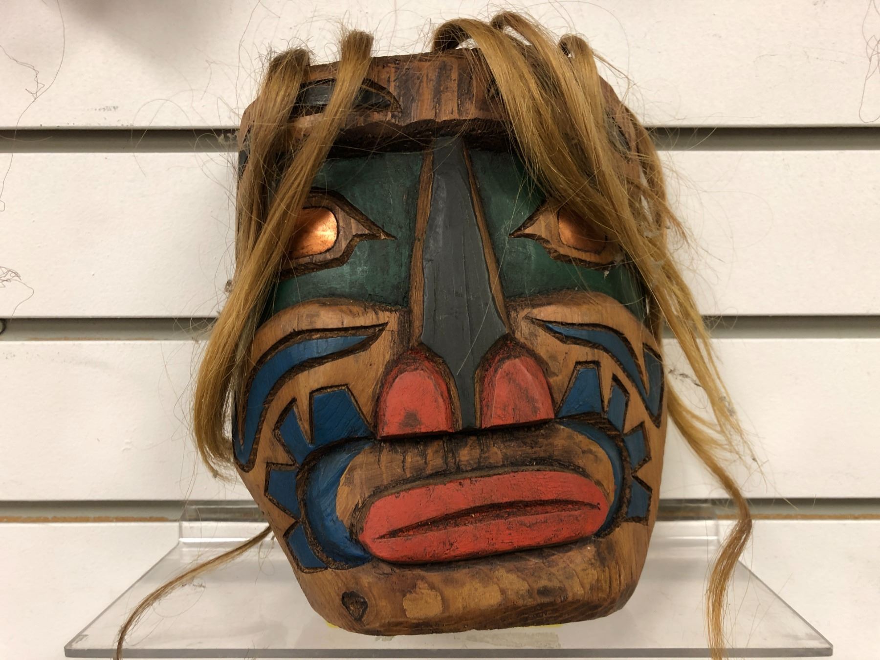 West Coast First Nations cedar carved face mask w/ copper eyes & authentic looking hair signed by Telqua 1998 - approx. 6in x 7 1/2in