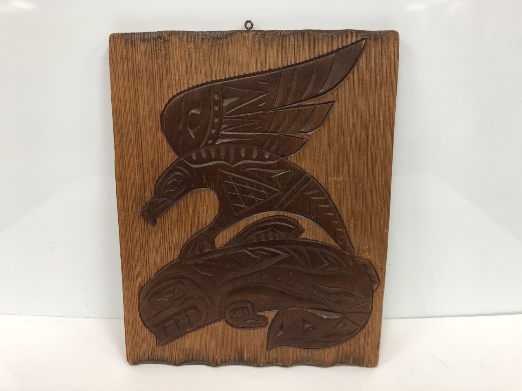 West Coast First Nations cedar carving "Killer Whale & Eagle" by N. Joseph - approx. 12in x 9 1/2in