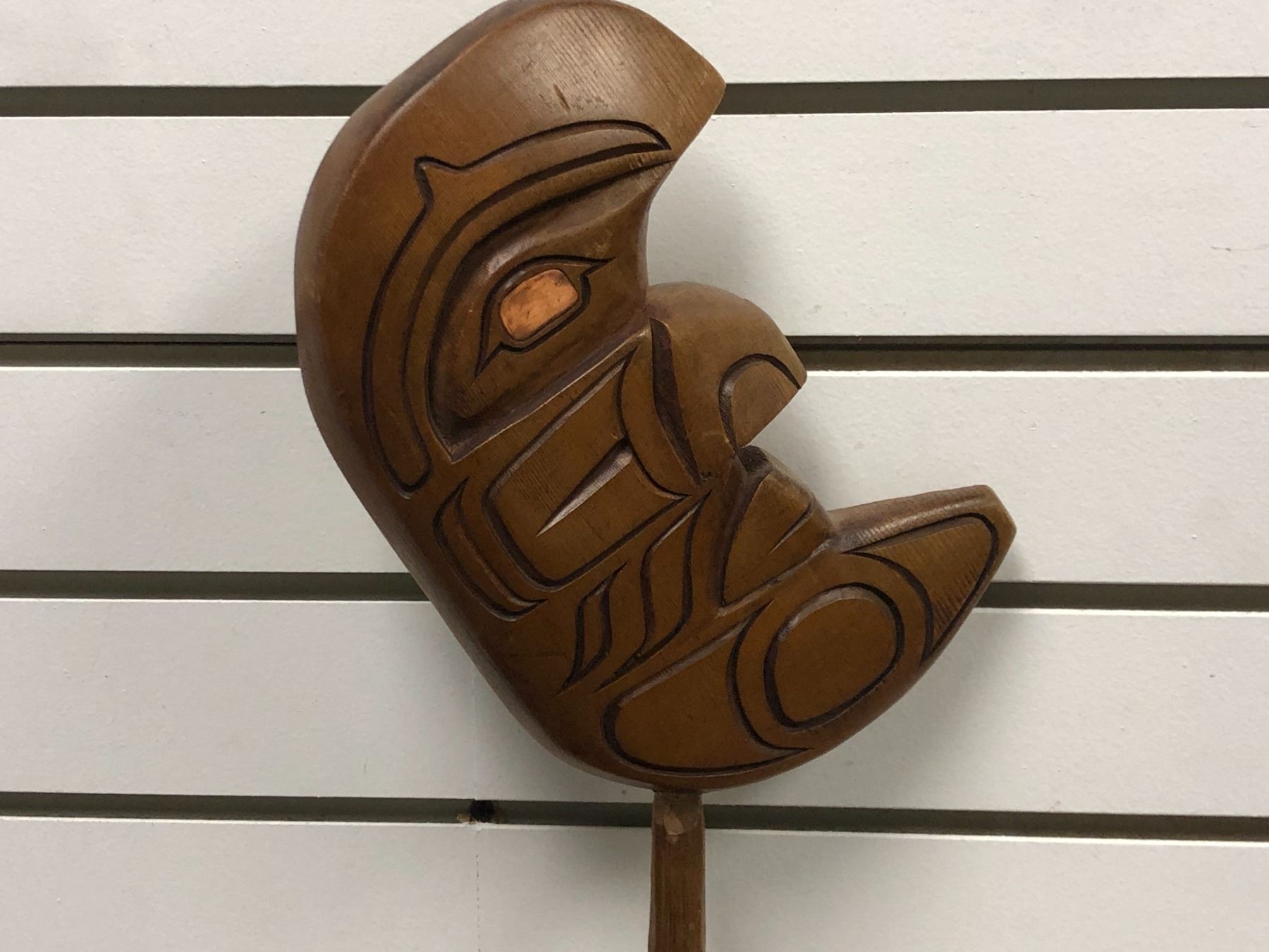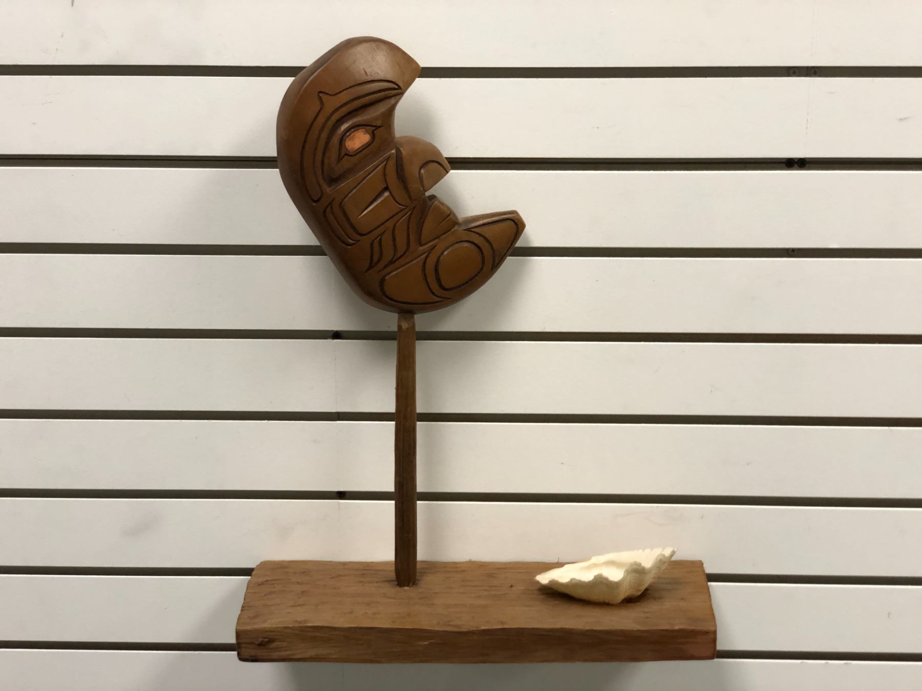 West Coast First Nations crescent moon cedar carving w/ copper eye & seashell accent - 20in tall