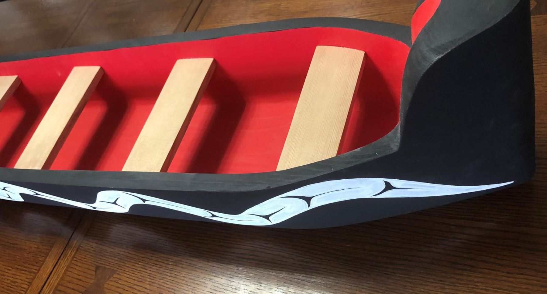 West Coast Native Dug Out Canoe with Sea Serpent Spirit....6 feet long, 11 inches high, 26 CM width. This Dugout Canoe is handcrafted Red Ceder by First Nation Artist Russell Tate......Russell Tate from the Ditidaht First Nation on the southwest coast of Vancouver Island. He started carving in 2004, artists such as Art Thompson and the artists on the Ravens and Eagles show inspired him. Russell learned how to wood carved mostly working on his own. He specializes in masks and paddles, but is now working on small poles and miniatures for regalia. Russell has worked with Ben David and Cecil Dawson, and has collaborated on several pieces with Cecil (Please note- This is large artwork and shipping will be near 250-300 dollars to ship anywhere in North America)