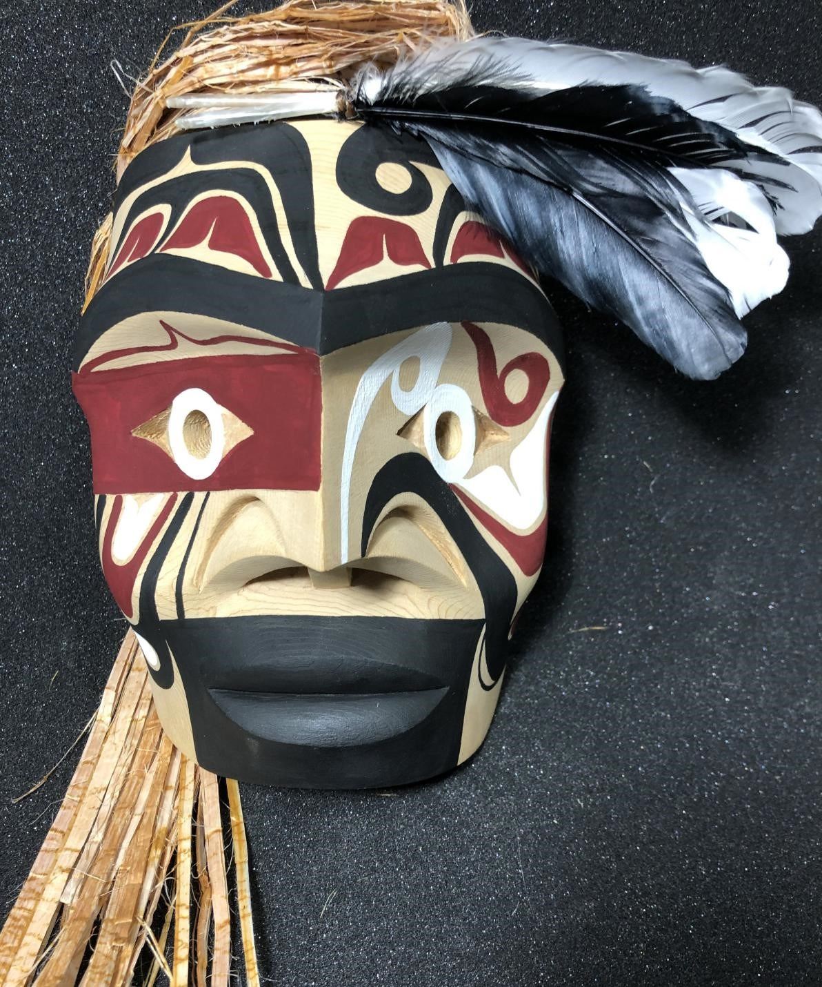 West Coast Native Hand Carved Warrior Mask........8 inches plus the accessories height....cedar baek hairs .....Hand Craved on the Red cedar by First Nation Artist Russell Tate......Russell Tate from the Ditidaht First Nation on the southwest coast of Vancouver Island. He started carving in 2004, artists such as Art Thompson and the artists on the Ravens and Eagles show inspired him. Russell learned how to wood carved mostly working on his own. He specializes in masks and paddles, but is now working on small poles and miniatures for regalia. Russell has worked with Ben David and Cecil Dawson, and has collaborated on several pieces with Cecil